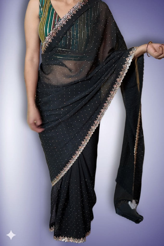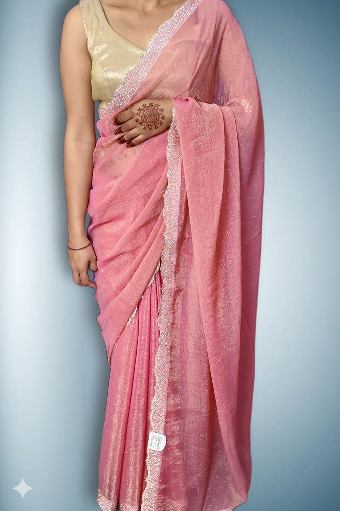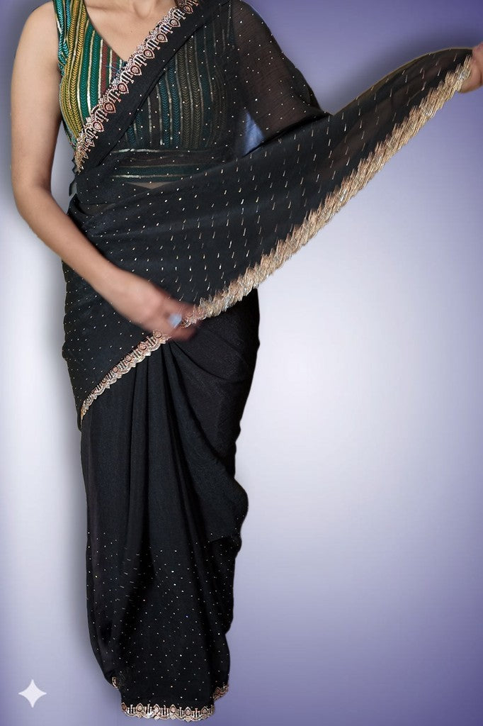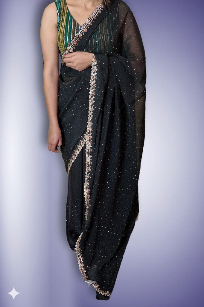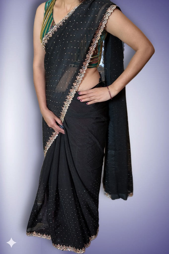 Featherlight organza with a soft pearlescent sheen drapes with airy grace. A scalloped sequin border and delicate allover sparkle add refined luminosity. Perfect for festive soirées, weddings, and elegant celebrations.