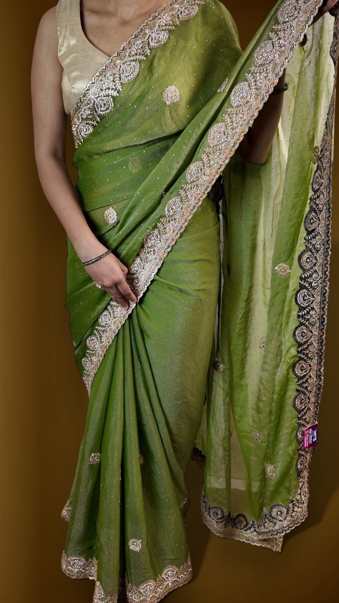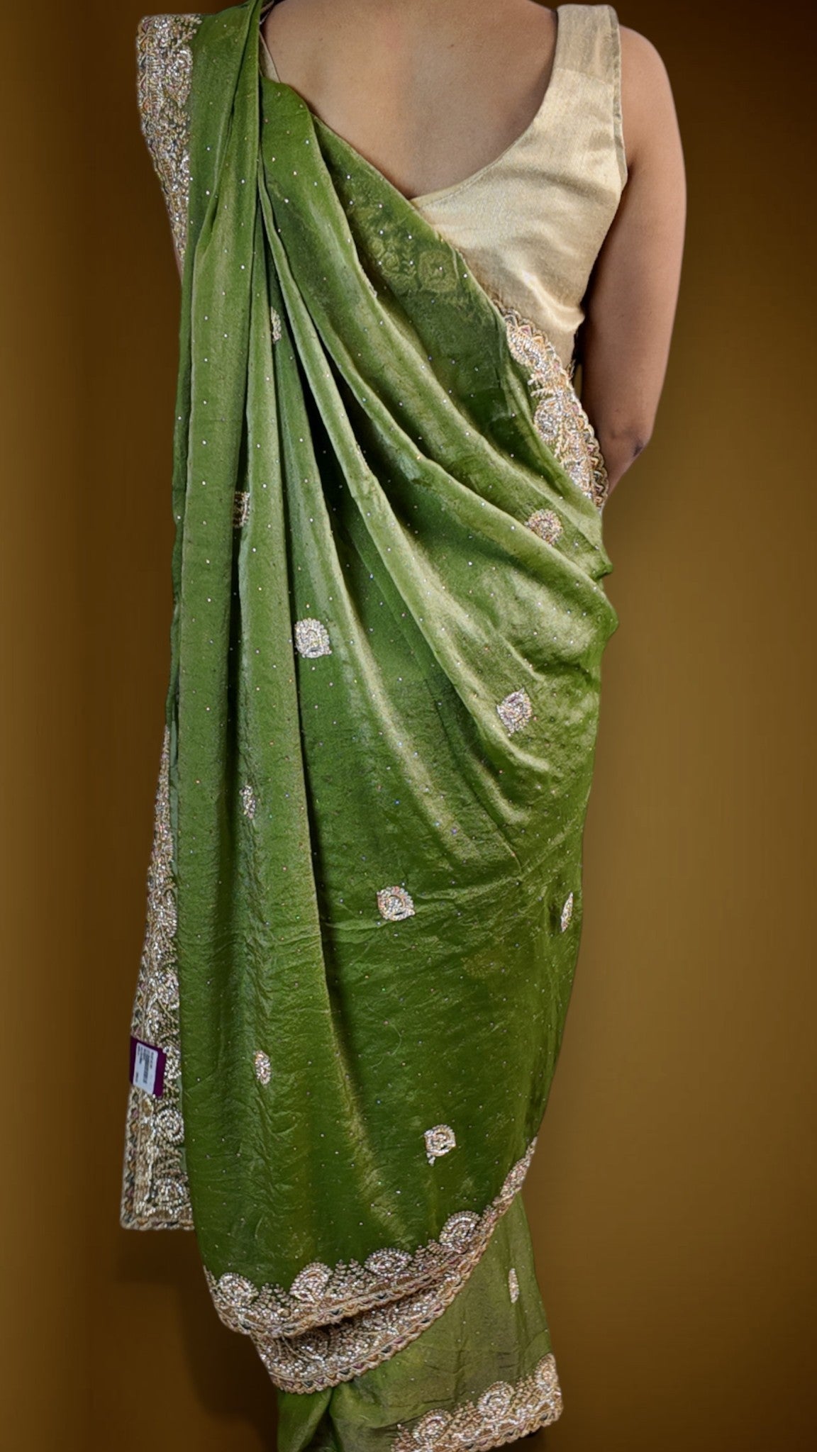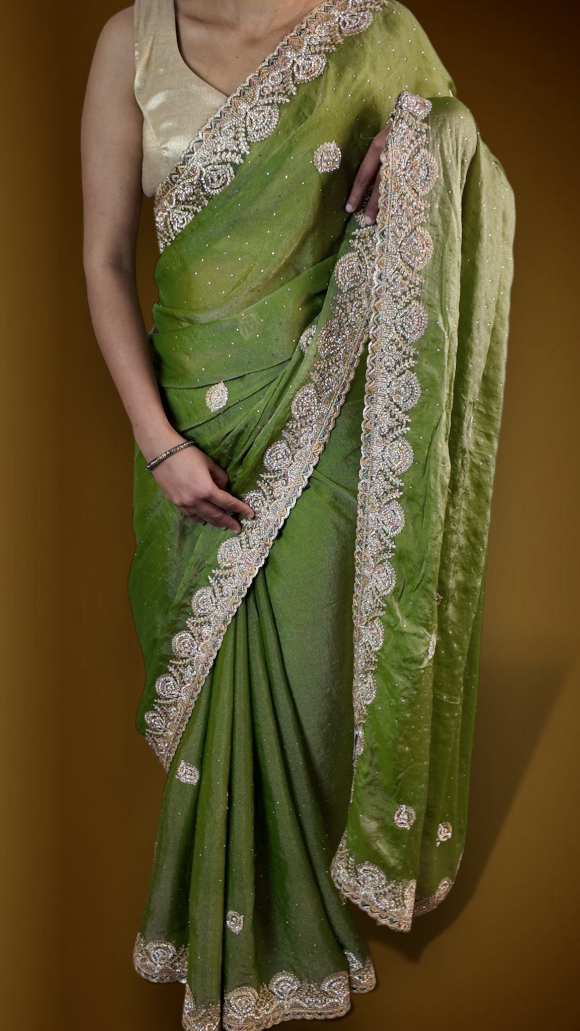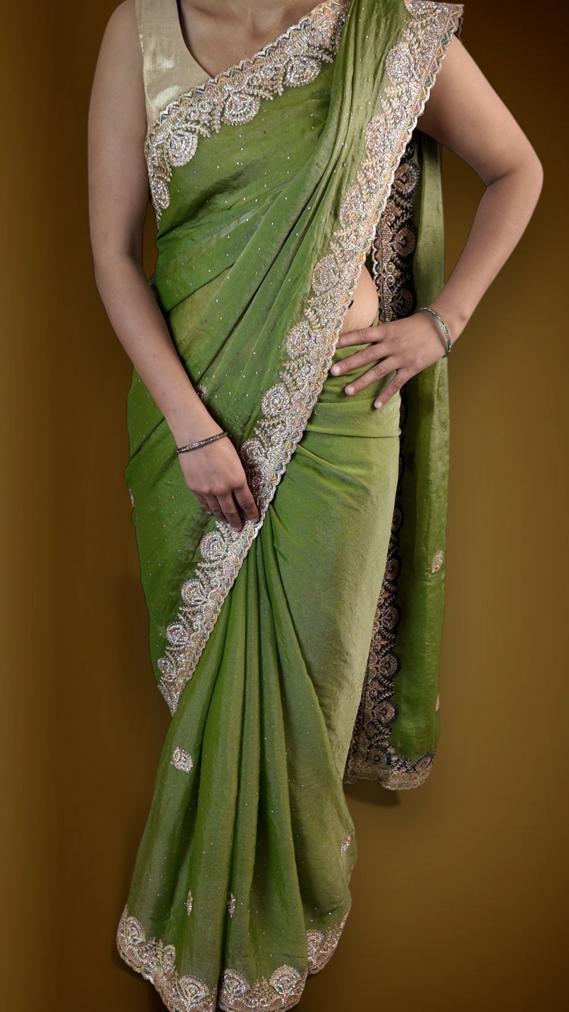 Lustrous silk drapes with a fluid fall, dusted with delicate butis for a refined shimmer. The saree is finished with an ornate scalloped border intricately detailed in zari and sequins. An elegant choice for festive soirées, weddings, and grand celebrations.