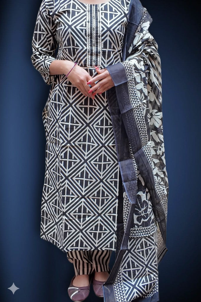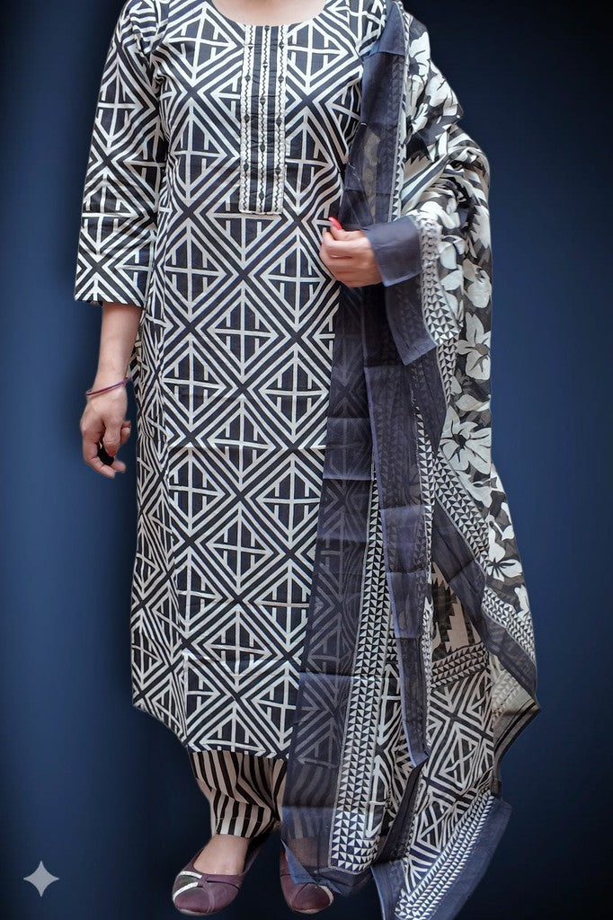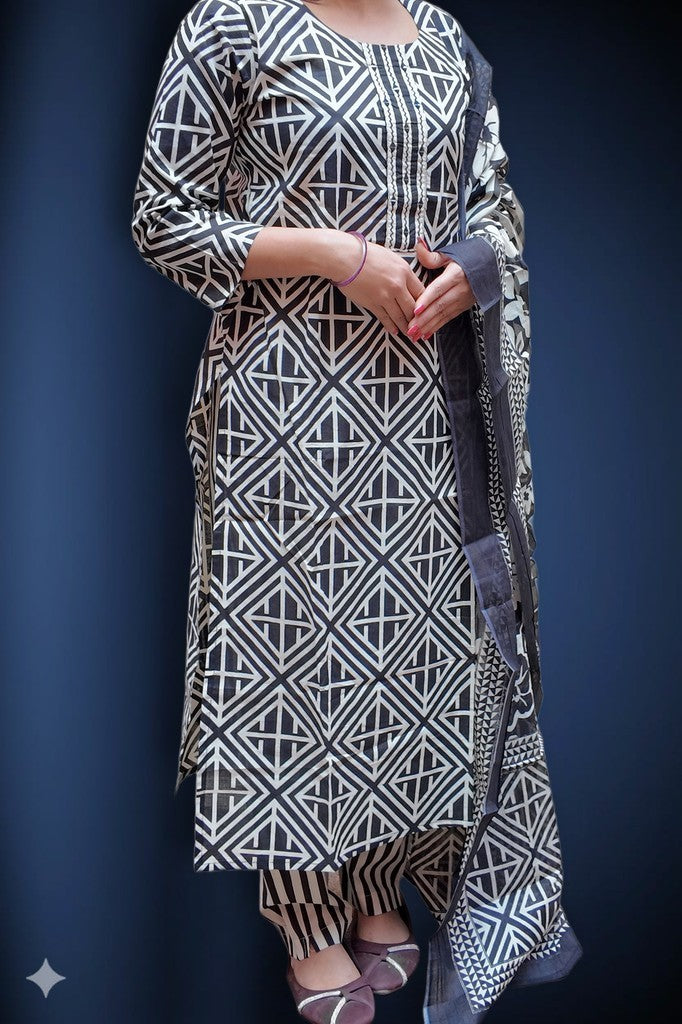 Crafted in breathable cotton with a soft hand feel, this set showcases a striking geometric motif. The structured kurta pairs with contrast striped pants and a coordinated dupatta for a refined finish. Ideal for elevated daywear, office chic, and intimate festive gatherings.
