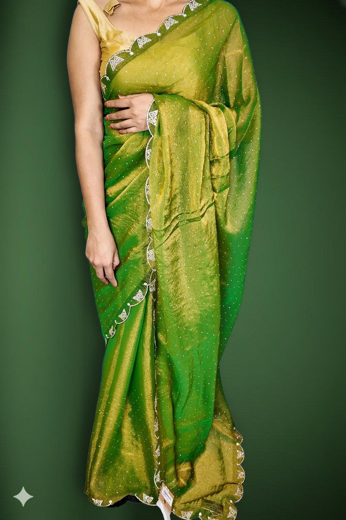 A fluid georgette drape with a luminous ombré green sheen and a soft, airy fall. Scattered sparkle work meets a scalloped, embellished border for a refined finish. Perfect for festive soirées, weddings, and elegant celebrations.