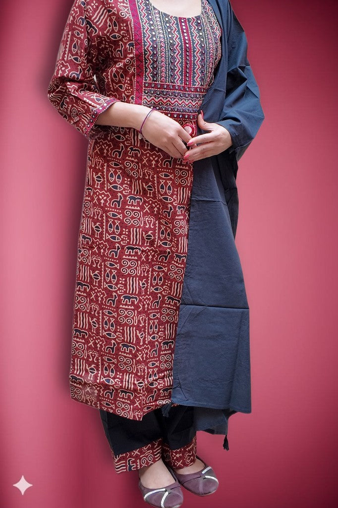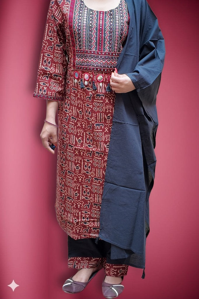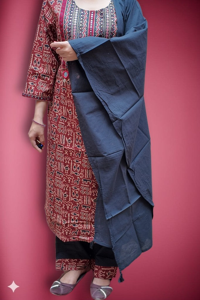 Supple cotton with a soft, breathable handfeel showcases comfort with polish. Folk-inspired motifs on the kurta and pant meet a solid contrast dupatta with refined finishing. Perfect for festive gatherings, cultural celebrations, and elevated daytime wear.