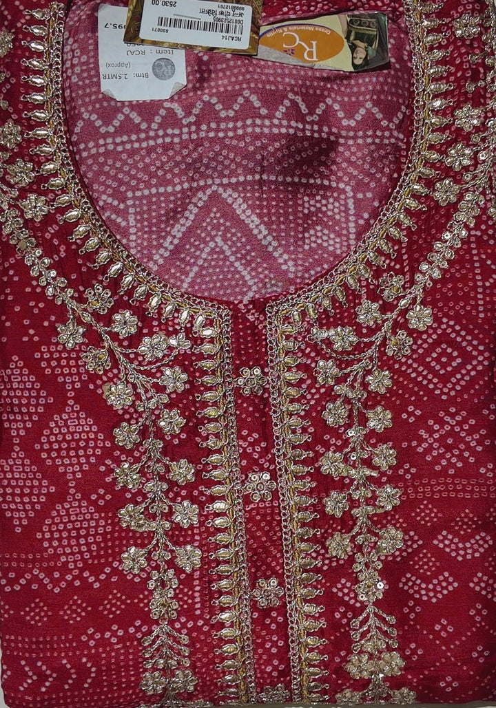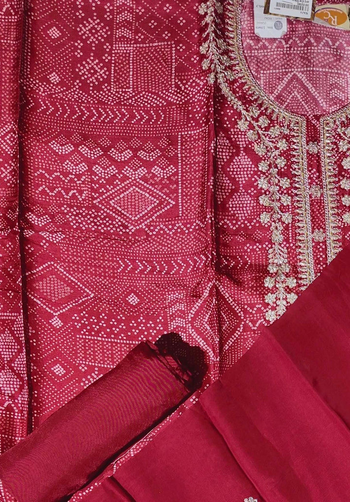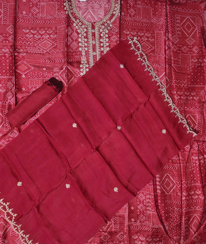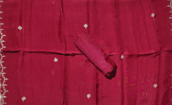 Immerse yourself in the vibrancy and elegance of the Crimson Grace Unstitched Suit Set. Crafted for those who appreciate the finer things in life, this suit features intricate floral embroidery on a rich red backdrop, creating a mesmerizing visual dance. The unstitched format allows for personalized tailoring, making it a versatile choice for various occasions, be it festive gatherings or intimate celebrations.\n\nThe fabric is soft yet durable, ensuring comfort while exuding sophistication. The detailed patterns are a testament to traditional craftsmanship blended with modern aesthetics, providing a unique piece to enhance your wardrobe. Easy to care for, this suit offers a timeless appeal, combining style with practicality.\n\nEmbrace the opportunity to create a statement ensemble that speaks volumes about your discerning taste. Whether it's a family function or a festive celebration, the Crimson Grace Suit promises to be a centerpiece of admiration. Make this exquisite set yours for just ₹2530.0, and let your style echo your inner elegance.