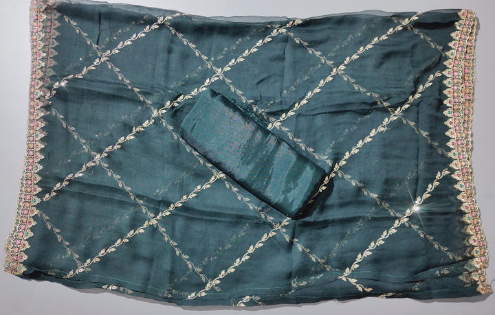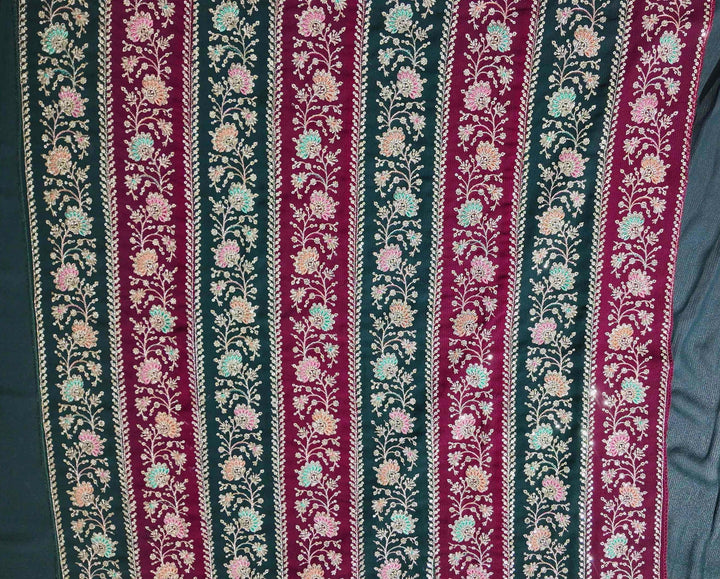 Transform your wardrobe with this captivating unstitched suit, a delicate blend of deep maroon and rich green hues adorned with intricate, floral embroidery. Each thread is woven with care, creating a mesmerizing tapestry of artistry ideal for festive celebrations or elegant soirées.\n\nCrafted from high-quality fabric, this suit offers unmatched comfort and a luxurious feel against your skin. The striking embroidery pattern is highlighted by shimmering sequins that catch the light, adding a touch of opulence to your ensemble.\n\nWhether you're stepping out for a wedding, a festive gathering, or an evening function, this suit empowers you to express individuality with grace. Simply pair it with your favorite accessories to create a look that's uniquely yours.\n\nCare Instructions: Dry clean recommended to preserve the beauty of the embroidery. Elevate your fashion game with the versatile design of this unstitched masterpiece, tailored just for you!