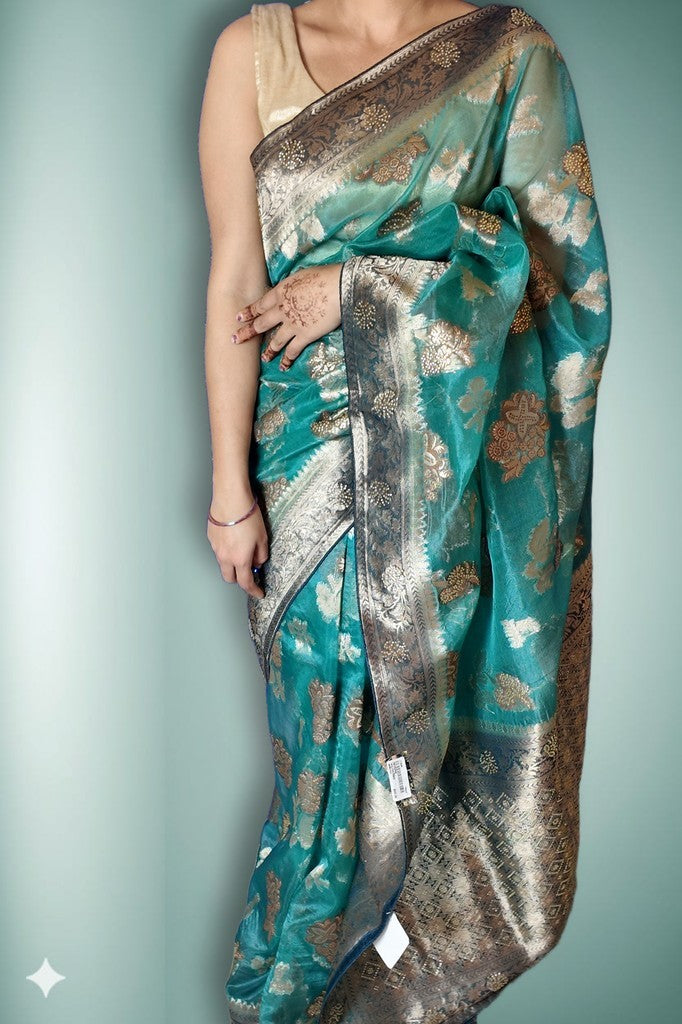 A lustrous Banarasi drape with ornate zari florals and a grand contrast pallu, finished with opulent borders. The silk-like handfeel and fluid fall embody timeless craftsmanship. Perfect for weddings, festive soirées, and heirloom-worthy celebrations.