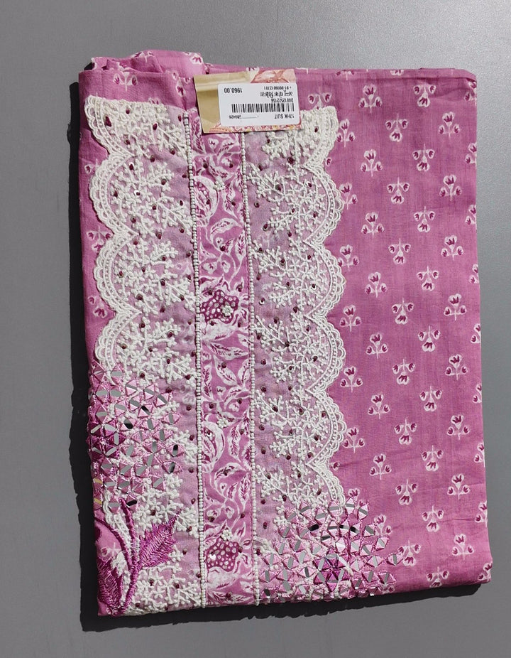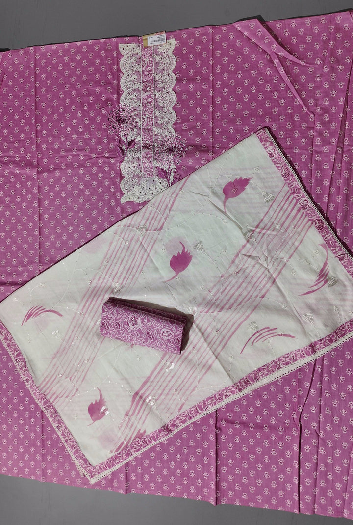 Unveil the charm of traditional attire with our Lavender Bloom Unstitched Suit, designed for those who appreciate the art of dressing up. This exquisite piece features delicate white embroidery intertwined with geometric accents, set against a vibrant lavender backdrop, perfect for festive gatherings or elegant soirees. \n\nCrafted from premium fabric, this suit offers a soft, luxurious feel while ensuring comfort throughout the day. The unstitched design allows you to tailor the fit to your preference, ensuring a perfect drape every time. Ideal for Diwali celebrations, weddings, or casual family events, it's an outfit that promises to make a statement.\n\nThe intricate patterns speak to a blend of modern aesthetics and traditional craft, giving you a look that's both contemporary and classic. Pair with your favorite accessories and you're all set to dazzle! \n\nCare Instructions: Dry clean recommended to maintain its vibrant color and intricate embroidery. Dive into the world of elegance with the Lavender Bloom Suit that celebrates culture with a touch of individuality.