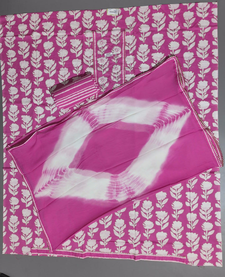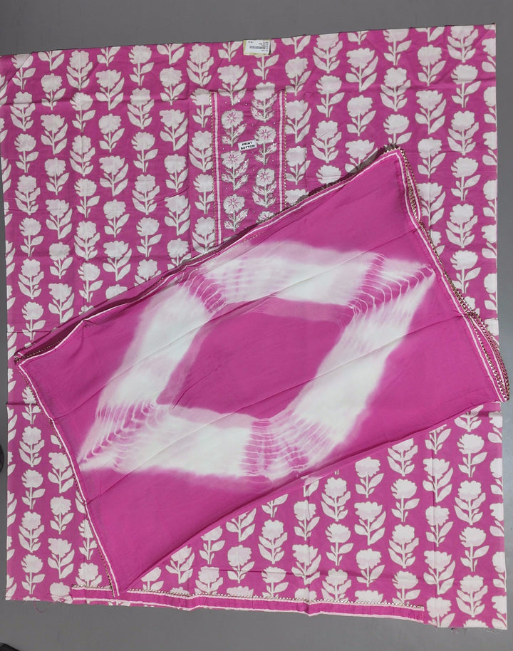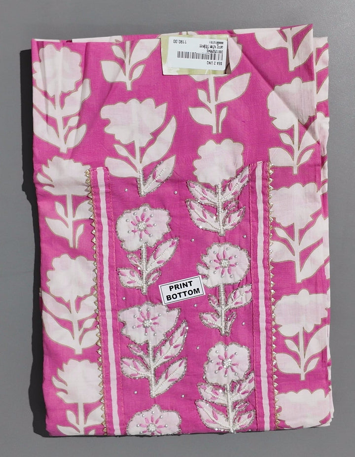 Unleash your inner fashionista with this exquisite unstitched suit, drenched in an eye-catching floral pink. Crafted for those who embrace boldness and beauty, this fabric gracefully harmonizes traditional charm with modern flair. The lively floral motifs are meticulously designed to bring out the vibrant personality in you, making it perfect for festive occasions and casual outings alike.\n\nMade from premium quality fabric, this unstitched suit offers unparalleled comfort and breathability, ensuring you feel as good as you look. Its versatile nature allows you to tailor it to your unique style, whether you prefer a chic salwar kameez or an elegant kurta.\n\nWith easy-to-care instructions, maintaining its vibrant colors and soft texture is a breeze. Simply hand wash or machine wash with similar colors, and it’s ready to dazzle once more. This unstitched ensemble isn't just a garment; it's a canvas for your creativity and style expression. Step out and make a statement with florals that speak volumes!
