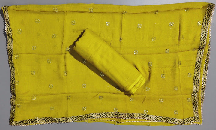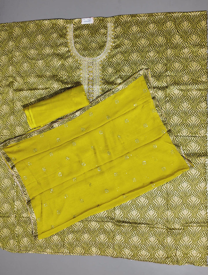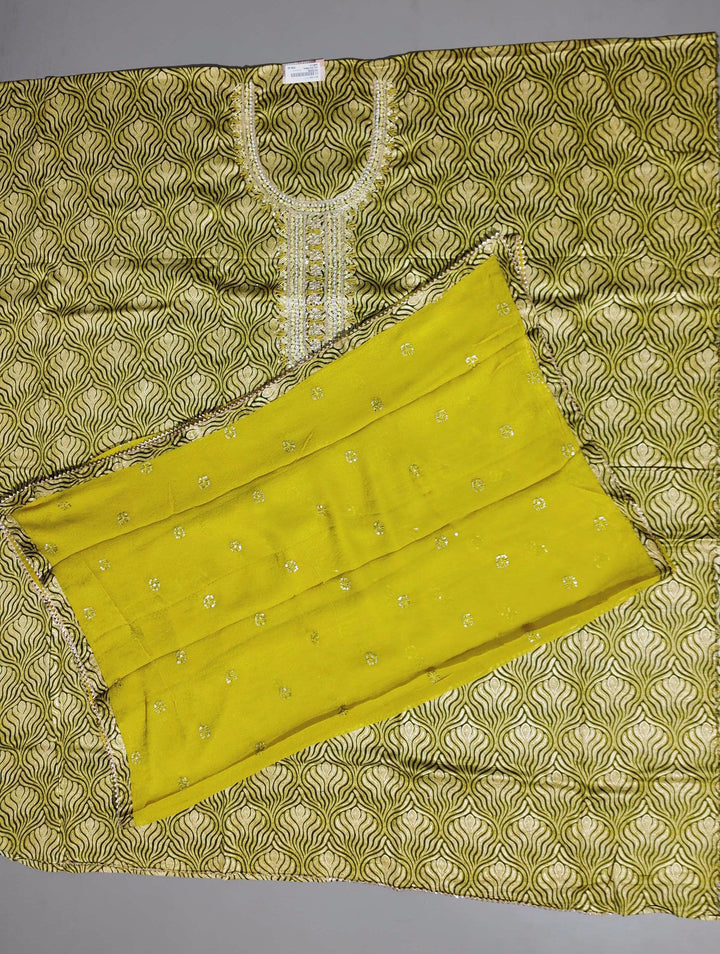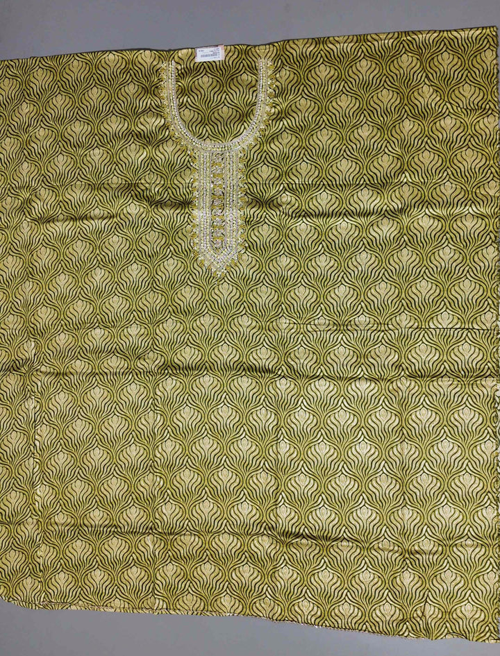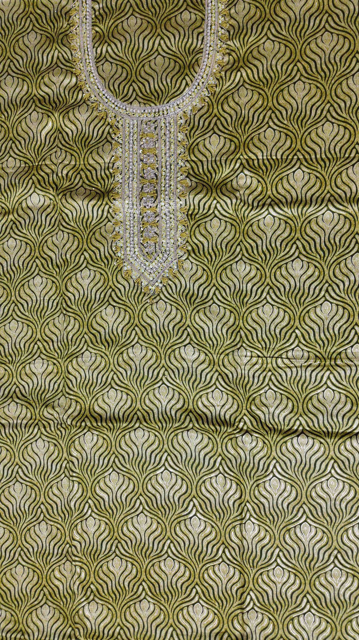 Elevate your wardrobe with this enchanting unstitched suit, designed to turn heads and spark conversations. The rich olive backdrop elegantly hosts a shimmering gold pattern, reminiscent of royal elegance and timeless beauty. Perfect for festive occasions or intimate gatherings, this fabric offers both style and comfort in every wear.\n\nCrafted with meticulous attention to detail, the suit features exquisite beaded embellishments along the neckline, adding a touch of glamour. The versatile design allows you to customize the fit to your liking, ensuring that each piece reflects your personal style with finesse.\n\nFabric care is simple and convenient, allowing this masterpiece to maintain its lustrous charm. Pair it with your favorite accessories to create a look that’s uniquely yours—whether it’s for a day of celebration or a special evening event.\n\nIndulge in the artistry of this unstitched suit, where traditional aesthetics meet contemporary flair, making it a coveted addition to any fashion enthusiast's collection. Secure this radiant piece today and step into a world of sophistication and grace.