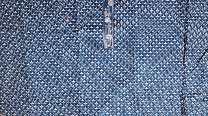 Step into elegance with our 'Midnight Blooms' unstitched suit, designed to make you shine in traditional celebrations. This indigo beauty features a charming floral pattern that is perfectly accented by intricate white embroidery along the border. Ideal for cultural festivities and family gatherings, this fabric allows you the freedom to tailor your own unique ensemble.\n\nCrafted from high-quality cotton, the fabric promises comfort and breathability, making it perfect for day-long wear. The luxurious texture ensures a premium drape, flattering various body types. Whether it's a grand wedding or an intimate pooja, this unstitched suit elevates your cultural style.\n\nTo ensure longevity, dry clean the material and follow standard fabric care routines. With its striking color and delicate design, the 'Midnight Blooms' suit fabric is a versatile addition to your wardrobe, ready to transform into either a classic or contemporary look, depending on your stitching preferences.\n\nEmbrace craftsmanship, elegance, and tradition with this one-of-a-kind piece – the perfect canvas for your fashion creativity.
