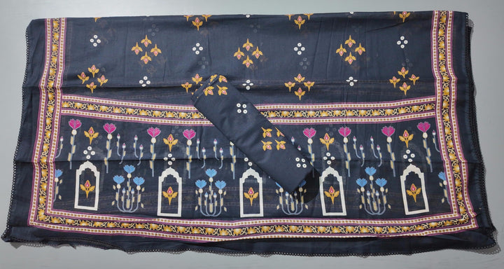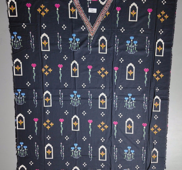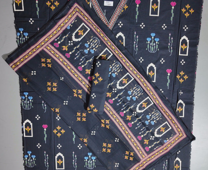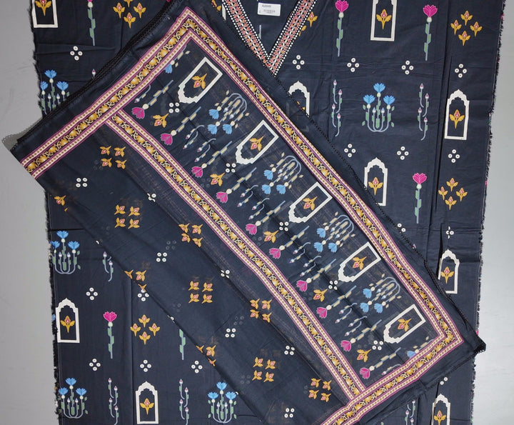 Step into sophistication with our 'Midnight Blossom' unstitched suit, a canvas for your personalized style. Crafted from premium quality fabric, this suit showcases a captivating dark base adorned with a vibrant floral motif, harmoniously balanced by intricate embroidery. Ideal for festive gatherings or casual outings, it offers a perfect blend of tradition and modern flair.\n\nThe breathable fabric ensures you stay comfortable throughout the day, while its unstitched design allows for a customized fit tailored to your body. Detailed care instructions are included to maintain the vivid colors and delicate embroidery.\n\nWhether you're seeking a standout piece for a special occasion or a versatile addition to your wardrobe, the 'Midnight Blossom' promises to elevate your ensemble with grace and elegance. Make it uniquely yours and leave a lasting impression wherever you go.