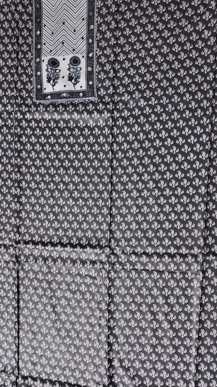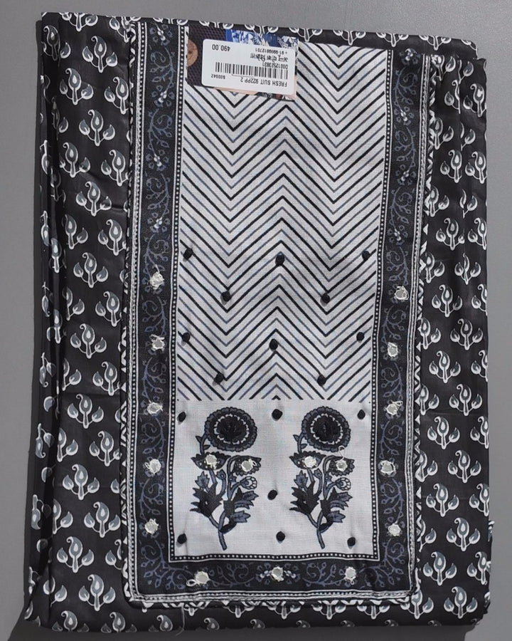 Step into the world of refined luxury with our 'Monochrome Majestic' unstitched suit. Crafted from high-quality fabric, this piece embodies elegance with its striking black and white palette and meticulously crafted floral patterns. The chevron lines add a modern touch, making it versatile for both traditional and contemporary designs. This fabric offers exceptional comfort, ensuring it drapes beautifully for any occasion, from casual gatherings to festive celebrations.\n\nThe intricate craftsmanship showcases impeccable attention to detail, with the floral motifs weaving a story of sophistication and charm. Designed for effortless care, this fabric ensures durability and ease of maintenance. Transform it into a custom-fit garment that’s uniquely yours, celebrating the blend of timeless tradition and modern style. Elevate your wardrobe with this stunning piece that promises to make a statement wherever you go.