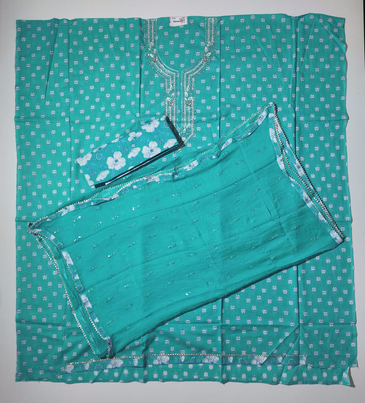 Dive into elegance with our Oceanic Bliss Unstitched Suit, crafted to captivate at festive occasions. The refreshing turquoise base, adorned with intricate floral patterns, embodies a blend of tradition and contemporary charm. Delight in the dazzling mirror work embellishments along the neckline, which add a touch of sparkle to your ensemble.\n\nDesigned with comfort in mind, the fabric is breathable and soft, ensuring you feel as good as you look throughout the day or night. This suit offers you the freedom to style it as per your preference, allowing for a personalized fit and flair.\n\nWhether it’s a family gathering, a festive celebration, or an upscale evening event, this unstitched suit will help you make a statement. Easy to maintain, gentle hand wash in cold water is recommended to preserve its vivid color and intricate detailing.\n\nStep out in style and grace, and let your attire speak volumes of your exquisite taste. Experience the joy of crafting your perfect fit with this stunning, versatile piece designed for the modern fashionista.