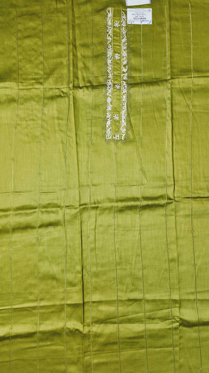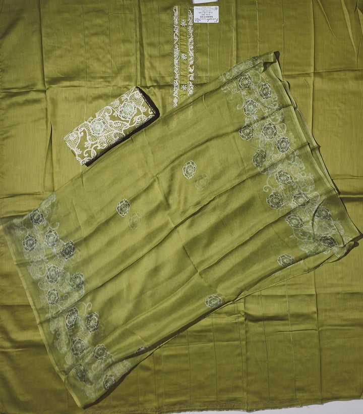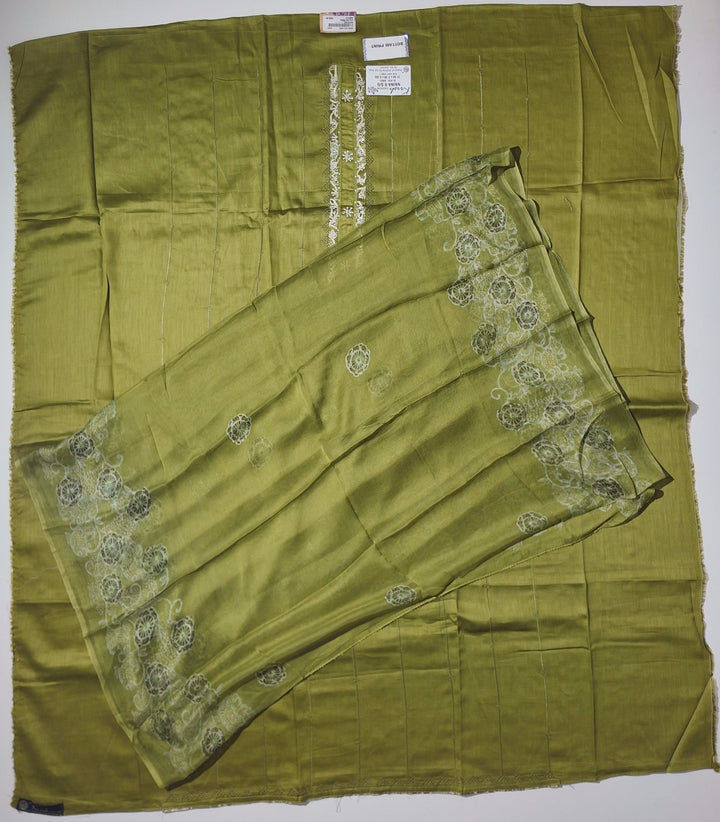 Discover the charm of artisan craftsmanship with this olive green unstitched suit, designed to blend tradition with modern aesthetics. Crafted with exquisite attention to detail, the fabric features a luxurious texture that feels soft and breathable against the skin, ensuring all-day comfort. \n\nThe suit is adorned with delicate white floral embroidery, adding a touch of sophistication and elegance to the ensemble. This unique pattern showcases meticulous work, highlighting the artistry involved in its creation. Ideal for festive occasions or casual gatherings, it offers a versatile canvas for personal tailoring, allowing you to style it to your preference.\n\nIts natural dye ensures a fade-resistant, vibrant color, making the ensemble a lasting addition to your wardrobe. Care instructions are simple: hand wash separately to maintain its intricate detailing and rich hue. \n\nStep into the spotlight with this unstitched suit, where heritage meets style, meticulously tailored to offer you both grace and individuality.