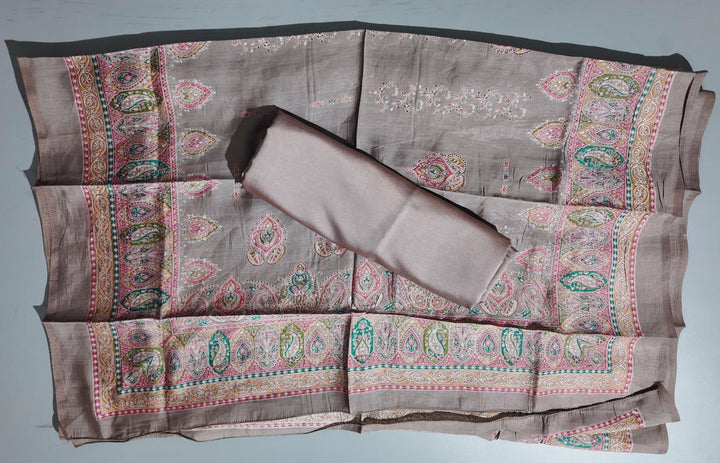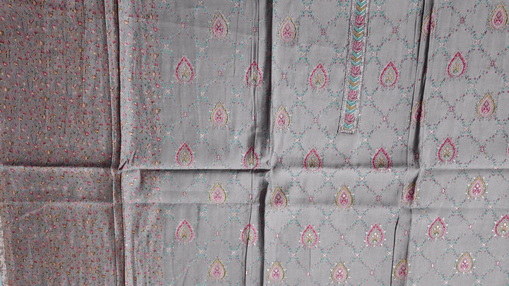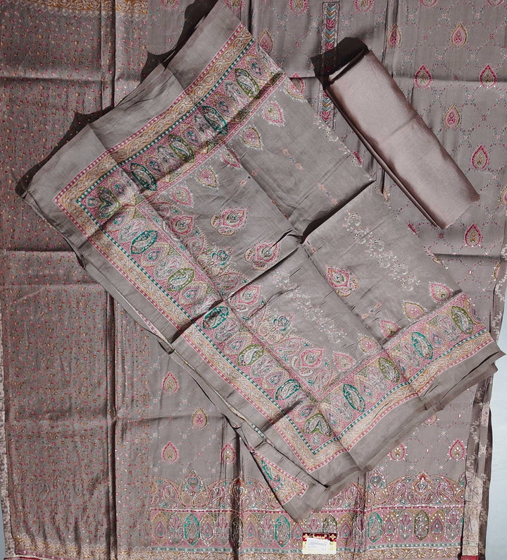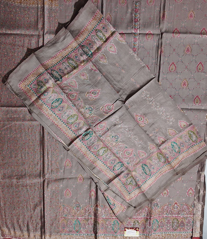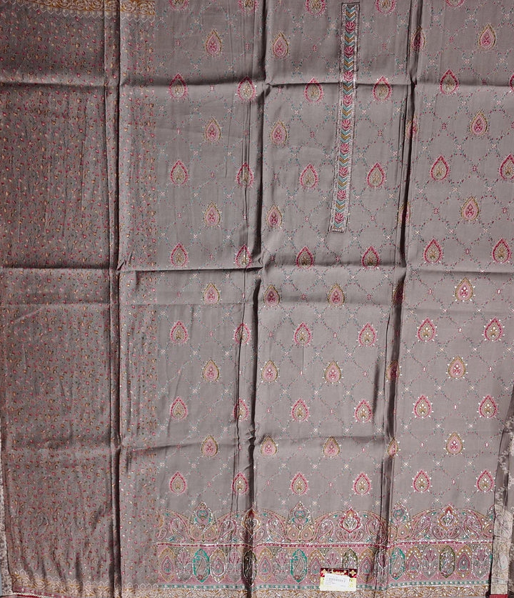 Dive into timeless elegance with our unstitched suit, draped in intricate paisley motifs that celebrate artistry. Crafted from a high-quality fabric blend, this suit offers both sophistication and comfort, perfect for festive gatherings or elegant soirées. The rich tapestry of colors, including subtle earth tones interlaced with vibrant accents, exudes a regal charm that's bound to turn heads.\n\nThe fabric’s soft, smooth texture ensures a comfortable fit, while the detailed patterns reflect superior craftsmanship. Customize your ensemble to suit any occasion, and embrace the freedom of personal tailoring. With easy care instructions, maintaining its pristine beauty is a breeze.\n\nWhether gifting or indulging yourself, this fabric is a symbol of refined taste and heritage. Elevate your wardrobe with this masterpiece and make every moment memorable.