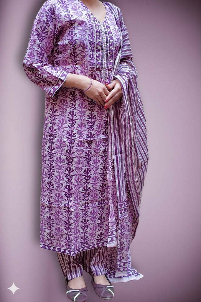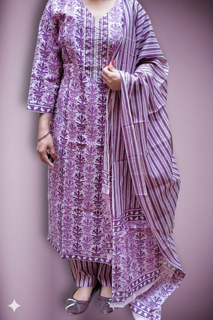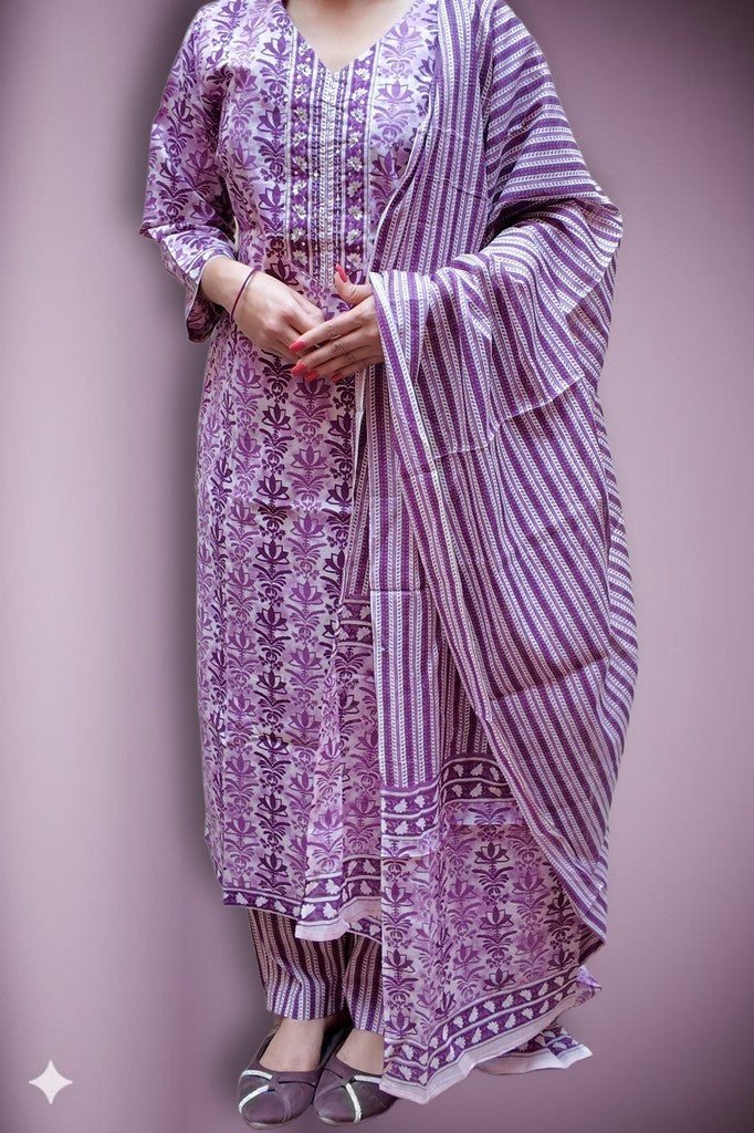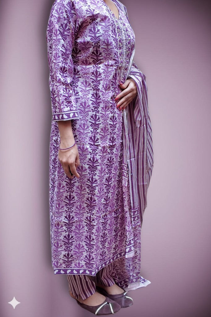 Supple cotton with a soft, breathable handfeel showcases refined floral prints and a detailed neckline for elevated charm. The coordinated striped dupatta and trousers create a poised, contemporary contrast. Ideal for festive brunches, intimate celebrations, and elegant daytime gatherings.