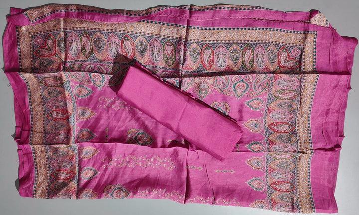 Elevate your wardrobe with this exquisite unstitched suit, woven from luxurious silk. The vibrant fuchsia hue is adorned with intricate paisley motifs and delicate threadwork that promise to turn heads at any gathering. Perfect for festive occasions or elegant evenings, this fabric provides ample room for customization to ensure a flawless fit. \n\nCrafted with meticulous attention to detail, the design features an ornate border pattern that adds flair without sacrificing sophistication. The soft, breathable fabric ensures comfort throughout the day, while the rich colors promise to remain unblemished wash after wash. \n\nThis piece is not merely an outfit; it’s a statement. Pair it with your choice of elegant accessories to create a personalized ensemble that speaks to your unique style. Easily maintain its pristine condition by following simple care instructions—gentle hand wash recommended to preserve the texture and vibrancy. \n\nStand out in a sea of generic styles with this distinctive silk suit, perfect for the discerning fashionista.