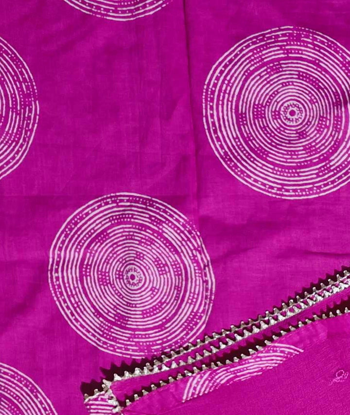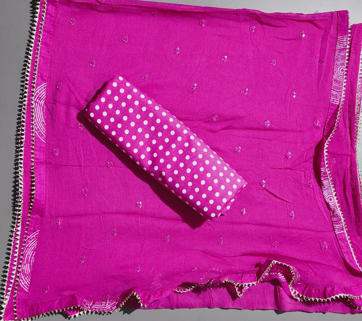 Transform your ethnic wardrobe with our vibrant fuchsia unstitched suit, crafted meticulously for those who appreciate artistry in fashion. This ensemble features a luxurious blend of comfort and style, highlighted by intricate embroidery that dances across the fabric in shimmering silver threads. The circular motifs add a touch of dynamic energy, making it perfect for festive occasions and celebrations.\n\nThe premium fabric ensures a breathable and soft experience, ideal for all-day wear. Customize the fit to your preference, allowing you to create a look that's uniquely yours. Whether you're attending a wedding or a festive gathering, this suit promises to keep you in the spotlight.\n\nCare tips: Dry clean preferred to maintain the fabric’s integrity and the vibrancy of its colors. Exploring a bold statement in ethnic fashion has never been more effortless.\n\nPrice: ₹1680.0 - Elevate your style and embrace elegance in every swirl of this beautiful suit.