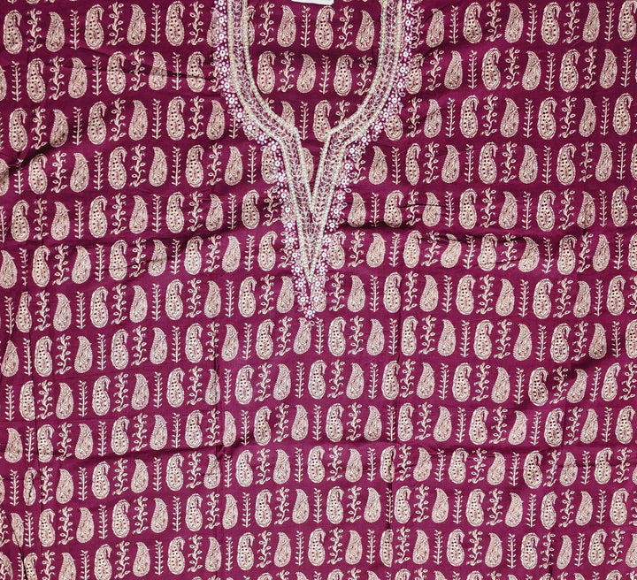 Step into the world of timeless fashion with our Regal Paisley Ensemble. This unstitched suit features a rich maroon base adorned with intricate paisley patterns and delicate floral embroidery. Perfect for festive occasions or elegant gatherings, the soft fabric ensures comfort all day long. The detailed craftsmanship around the neckline enhances its regal appeal, allowing for a variety of neckline styles when tailored. Pair it with your favorite accessories to create a personalized look. Easy to care for, this fabric requires gentle hand washing to maintain its vibrant colors and luxurious feel. Unleash your creativity and stitch it to express your unique style. Elevate your wardrobe with this versatile piece, perfectly blending tradition and modernity.