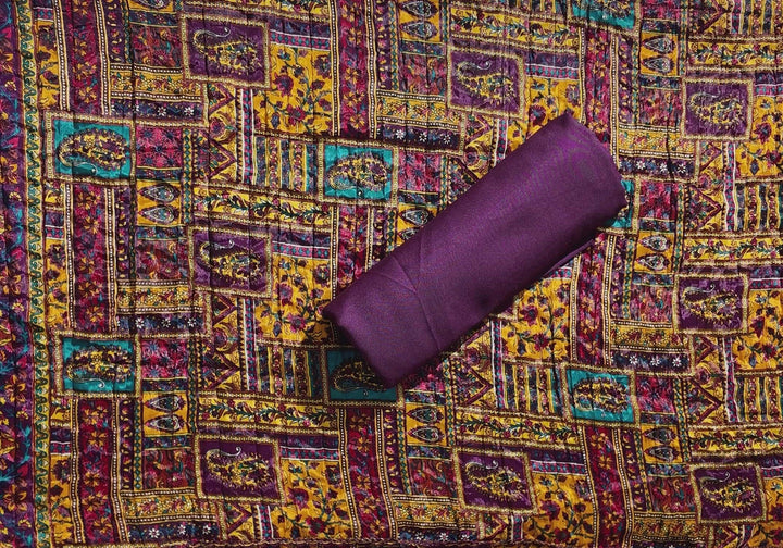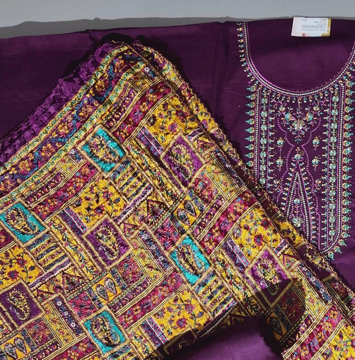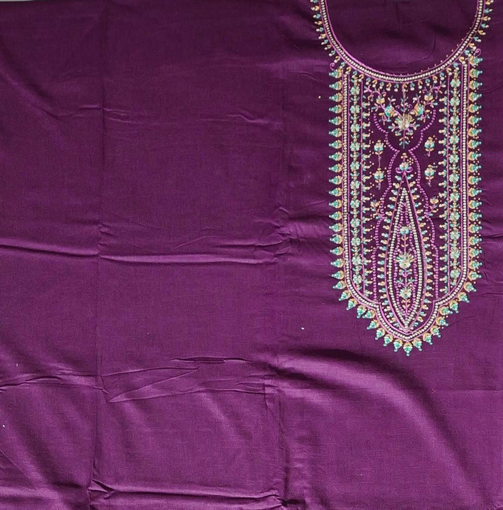 Discover elegance with our exquisite plum unstitched suit, where traditional craftsmanship meets modern style. This luxurious ensemble is crafted from high-quality cotton blend fabric, offering a soft touch and breathable comfort. The rich plum hue serves as the perfect backdrop for intricate embroidery that features meticulous floral and geometric patterns in vibrant turquoise and gold threads, adding a splash of color and elegance to your attire.\n\nPerfect for festive occasions or casual gatherings, this versatile piece allows you to tailor your style according to your preference, ensuring a personalized fit. Pair it with your favorite accessories to create a statement and leave a lasting impression. \n\nFor easy maintenance, gently hand wash or dry clean to preserve the fabric's luster and the embroidery's intricate details. Embrace the seamless fusion of tradition and trend with this stunning unstitched suit and reinvent your wardrobe this season.