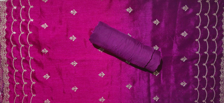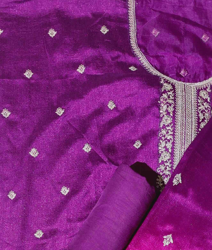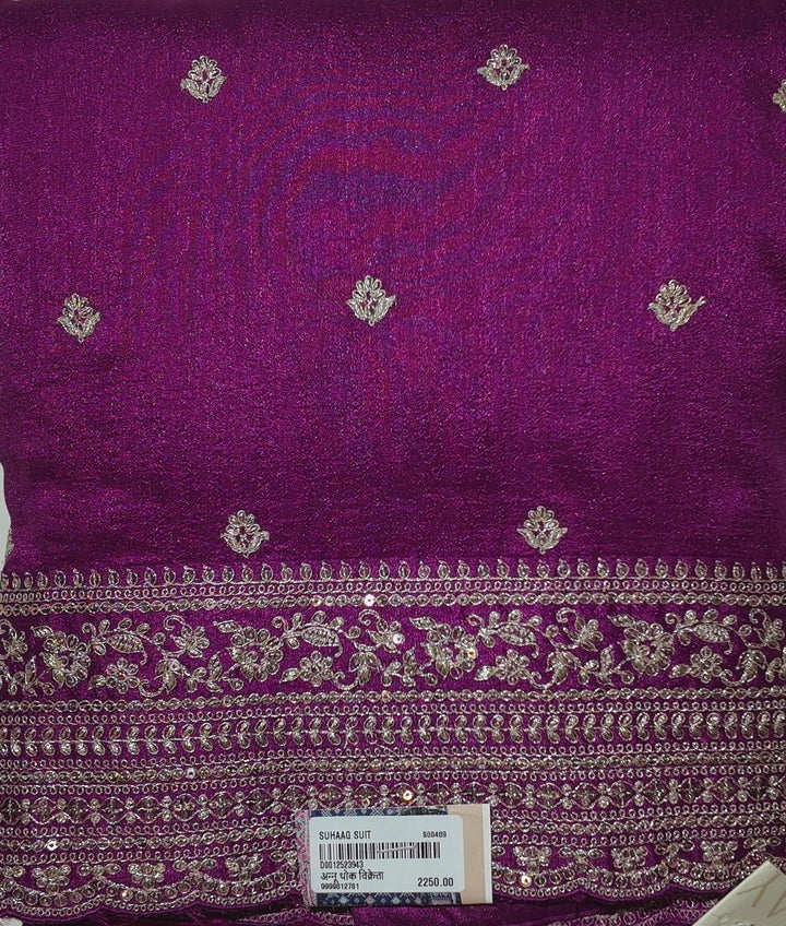 Step into sophistication with our unstitched suit in a rich violet hue that captures immediate attention. Intricately adorned with exquisite silver embellishments, this suit brings a touch of regal charm and modern allure. Perfectly crafted for festive occasions or evening gatherings, the detailed embroidery showcases fine craftsmanship that tells a story of elegance and tradition. \n\nMade from high-quality fabric, it offers a luxurious feel against your skin while providing comfort throughout your day or night. Whether you're attending a wedding, a family function, or a festive celebration, this unstitched suit allows you the freedom to tailor it to your desired fit and style, ensuring a perfect drape that flatters your silhouette. \n\nCare for this masterpiece is effortless, requiring only gentle handwashing to maintain its vibrant color and embellishments. At a price of ₹2250.0, indulge in an outfit that merges elegance with personal expression, setting you apart in any gathering. Elevate your wardrobe with this distinguished attire and embody the essence of timeless beauty.