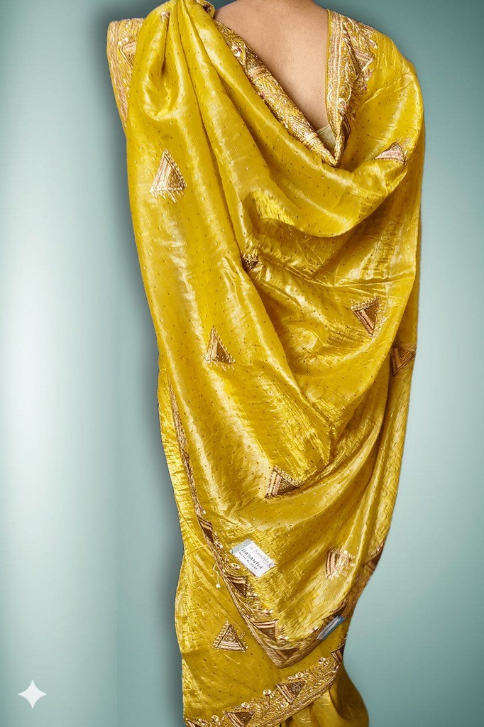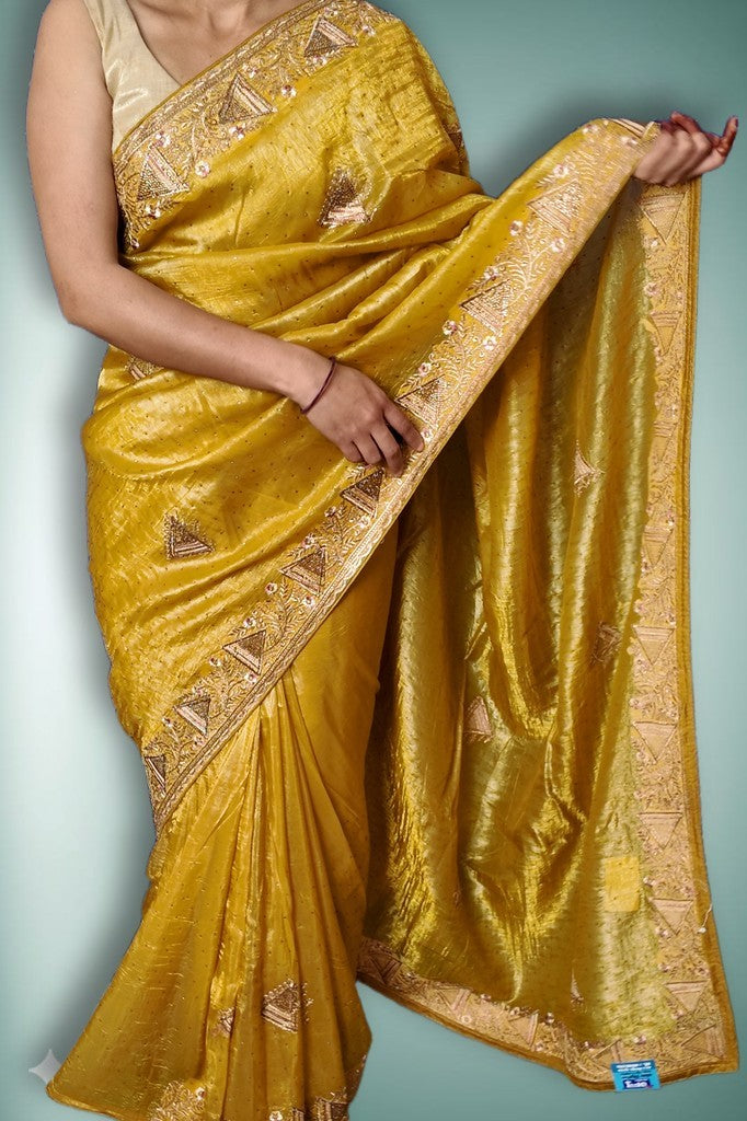 Lustrous silk with a smooth, fluid drape and a refined sheen. Intricate zari embroidery and delicate sequin motifs enrich the borders and pallu with exquisite craftsmanship. Perfect for weddings, festive soirées, and grand celebrations.