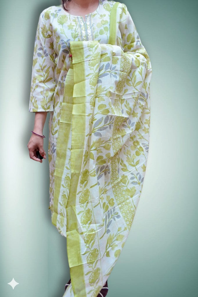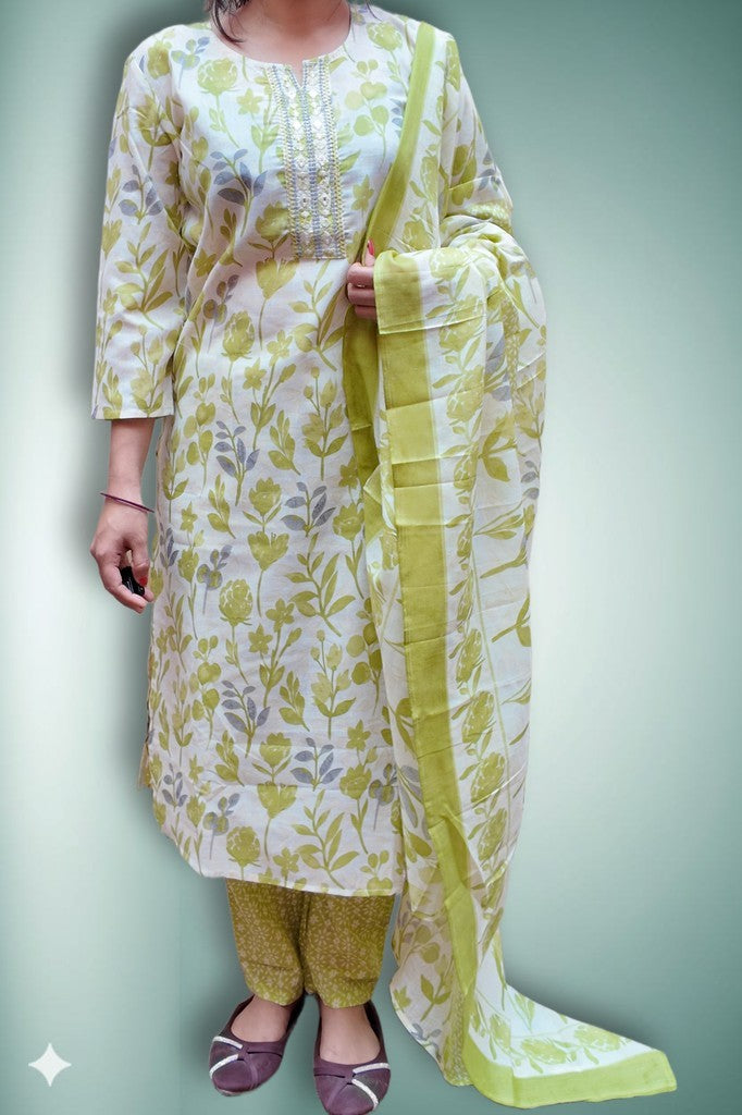 Breathable cotton with a soft handfeel, adorned with delicate floral motifs and subtle neckline detailing. The coordinated kurta, tapered pants, and airy dupatta create an effortlessly polished silhouette. Perfect for daytime festivities, summer gatherings, and refined celebrations.