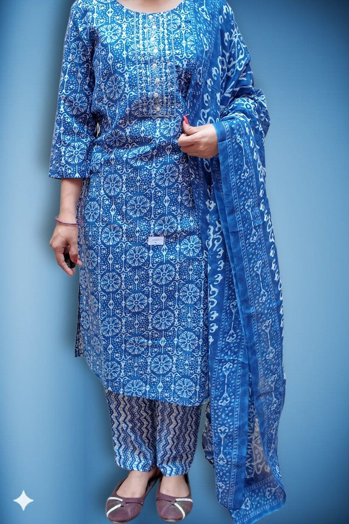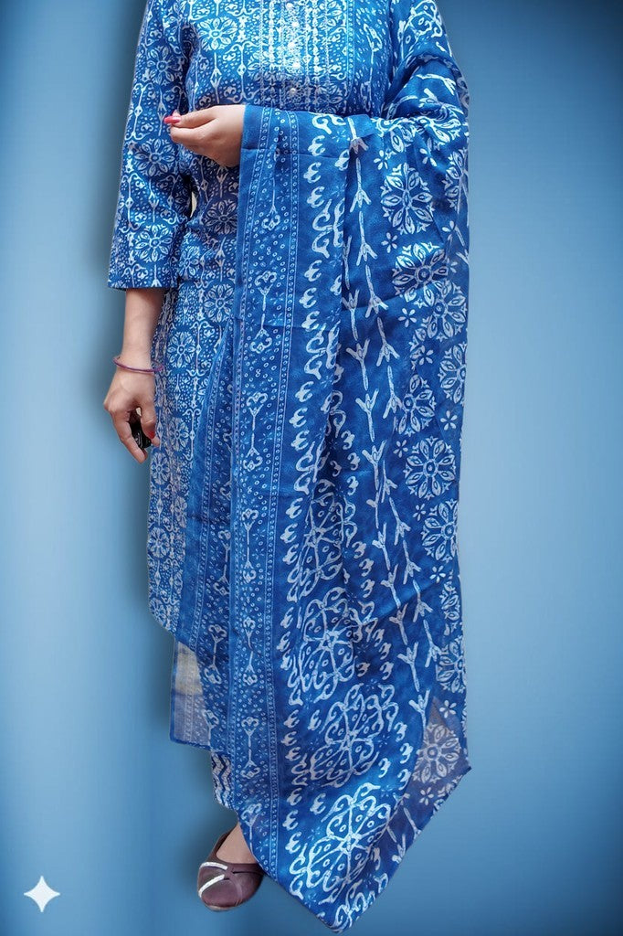 Crafted in breathable cotton with artisanal block prints, the set features a refined kurta with delicate pintucks, tapered pants, and a fluid matching dupatta. The lightweight handfeel and crisp finish exude effortless sophistication. A graceful choice for festive brunches, intimate celebrations, and elegant daywear.