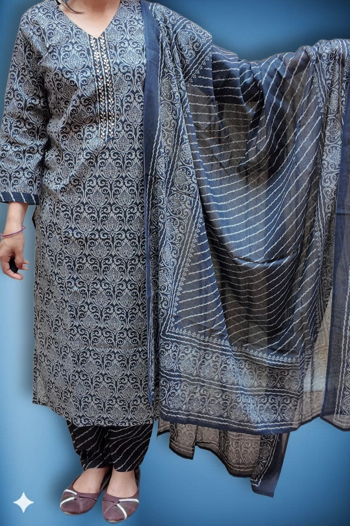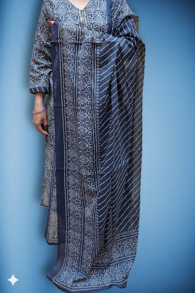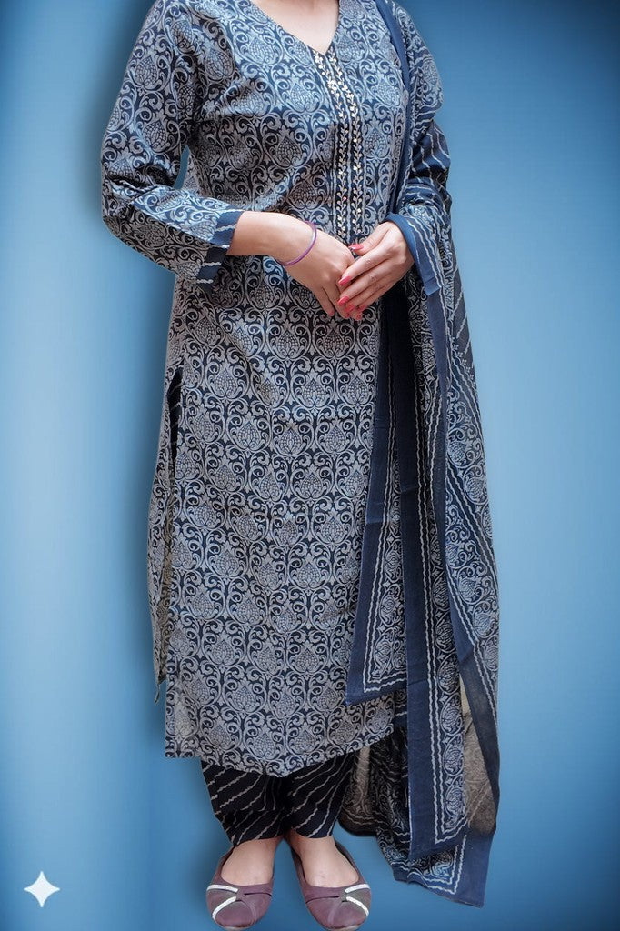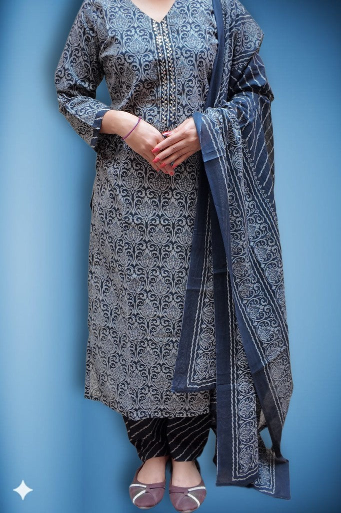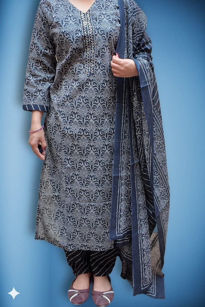 Soft, breathable cotton with a smooth handfeel shapes a tailored kurta, patterned salwar, and a bordered dupatta. Delicate vine motifs and refined detailing elevate the artisanal print. Ideal for festive brunches, intimate celebrations, and elegant daywear.