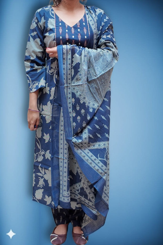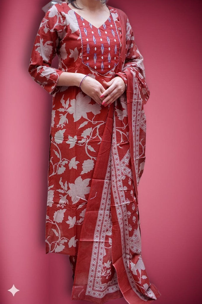 Soft, breathable cotton with a graceful drape, tailored into a V-neck kurta and pants, paired with a coordinated dupatta. All-over botanical prints and refined border accents elevate the ensemble. Ideal for festive brunches, intimate celebrations, and elegant daywear.