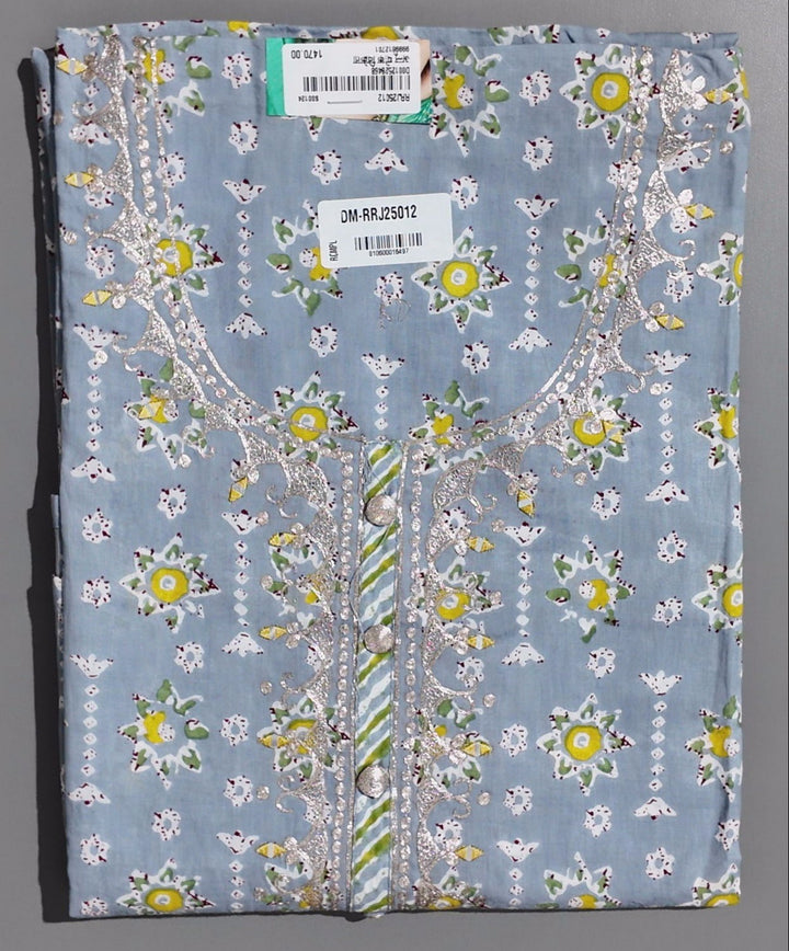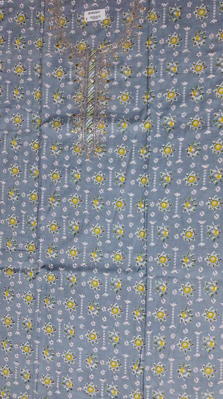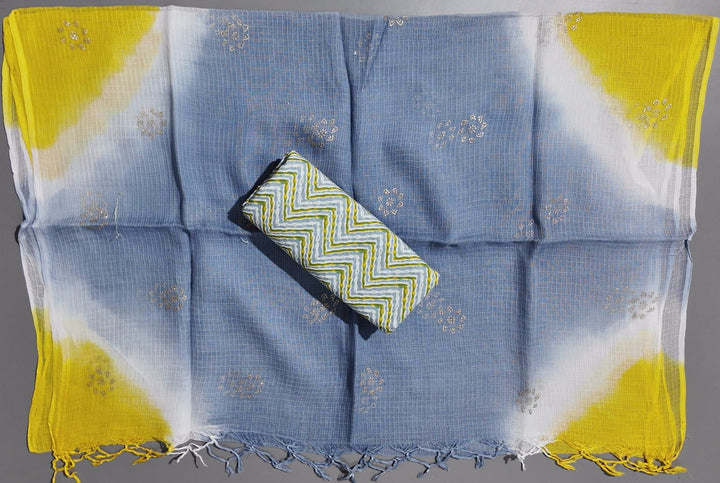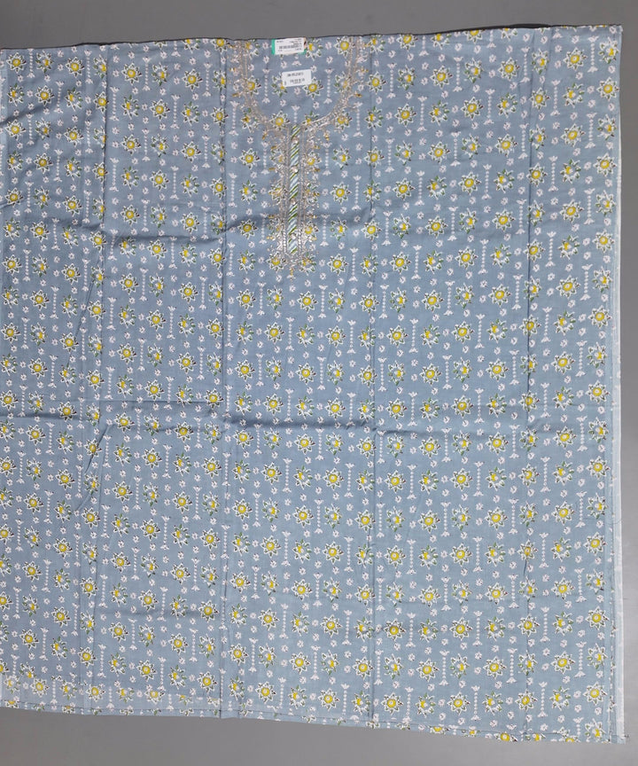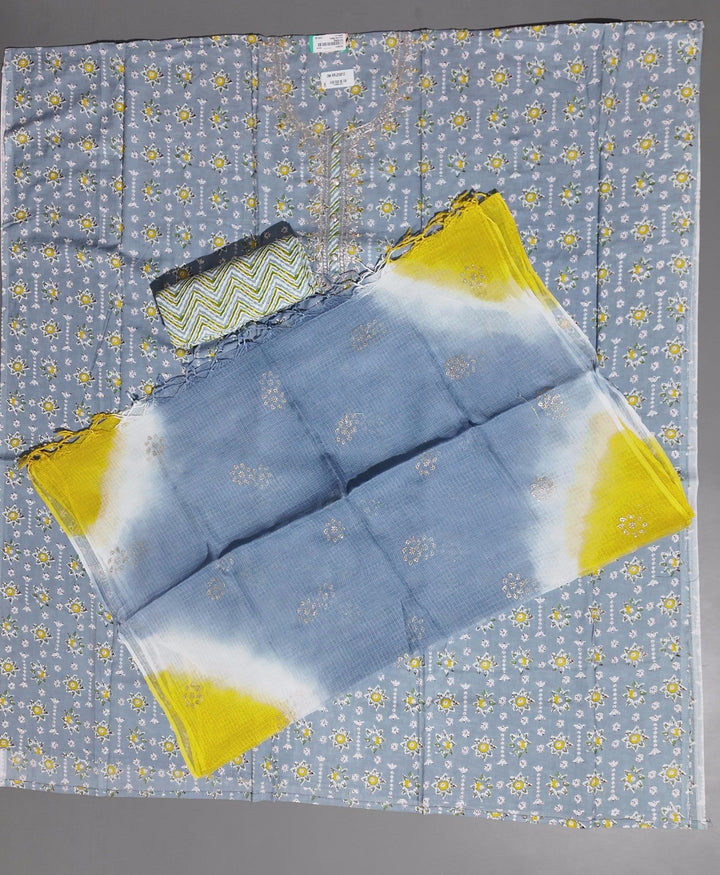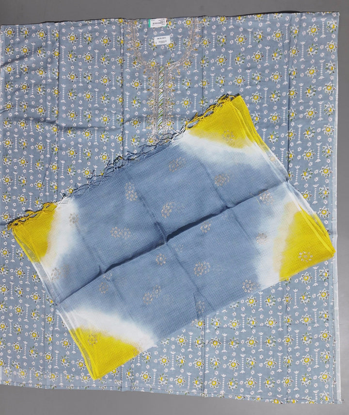 Step into a world of artisanal charm with our Serene Floral Unstitched Suit, a testament to aesthetic grace and craftsmanship. Cloaked in a soothing blue hue, this suit features a delicate floral pattern interwoven with vibrant yellow and green accents, reminiscent of a spring garden in full bloom. Perfect for festive gatherings or casual outings, the unstitched design offers the freedom to tailor the fit to your comfort and style. \n\nCrafted from breathable and soft fabric, it promises all-day comfort, making it an ideal choice for warmer days. The intricate embroidery work along the neckline adds a touch of sophistication, ensuring you stand out in any crowd. Whether you aim for a traditional silhouette or a contemporary flair, this suit allows endless customization. \n\nCare for this beautiful piece is simple—just hand wash with mild detergent and air dry to maintain its vivid colors and intricate details. Add a touch of elegance and individuality to your wardrobe with this versatile and expressive creation. Price: ₹1470.0. Transform your fashion narrative with unmatched style and quality.