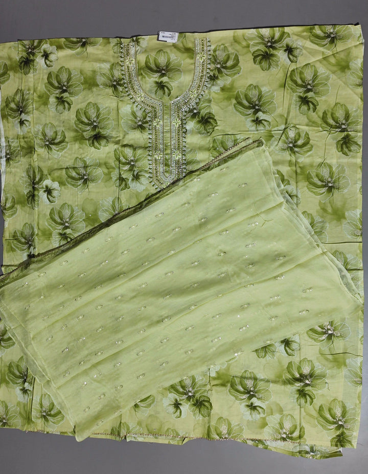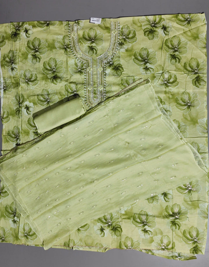 Embrace the soothing allure of our 'Serenity Bloom' unstitched suit. Crafted for those who value individuality and style, this piece features a delicate interplay of floral patterns in a calming green palette, perfect for springtime elegance. The high-quality fabric ensures breathability and comfort, making it ideal for day-long wear. Adorned with intricate embellishments, this suit reflects a subtle sparkle under light, adding a touch of glamour to your outfit. Its unstitched nature allows for a personalized fit, tailored to your specific style and body shape. Whether attending a festive gathering or a casual meet-up, the 'Serenity Bloom' is your go-to choice for an effortlessly chic look. Elevate your wardrobe with this versatile piece that combines tradition with modern flair. Easy to care for, simply hand wash or dry clean to maintain its pristine state. Elevate your style with 'Serenity Bloom' and let your outfit speak for itself.
