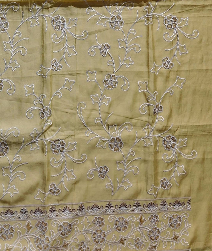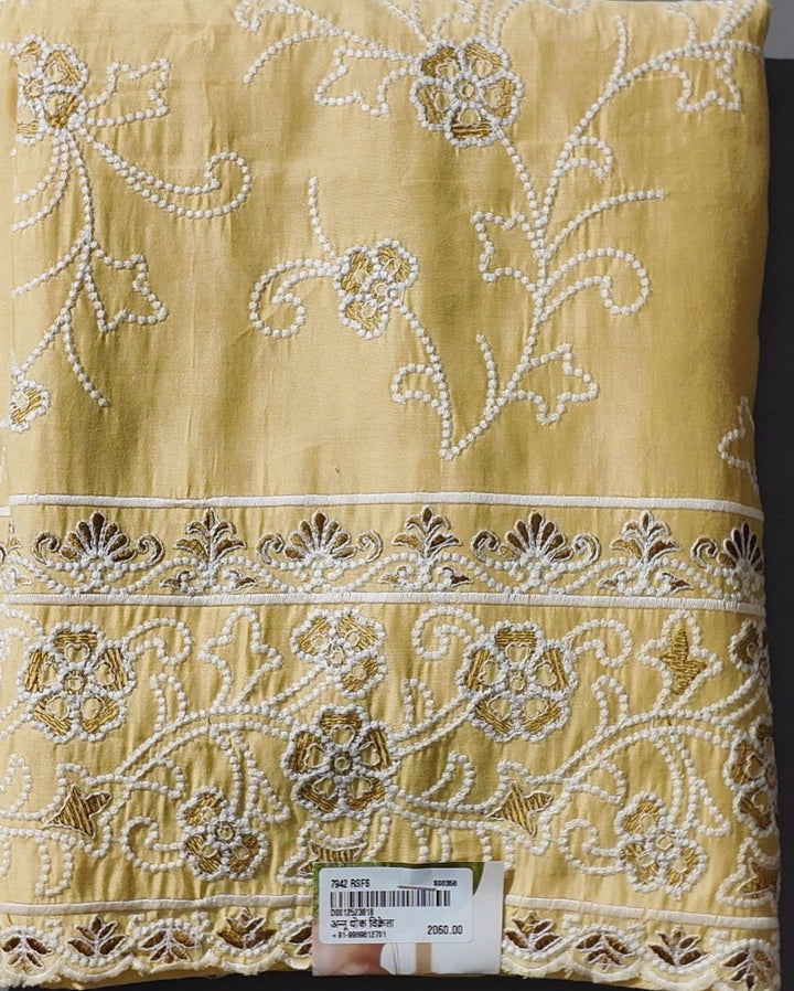 Embrace timeless elegance with our Sun-Kissed Charm Floral Embroidered Unstitched Suit. Crafted from premium quality fabric, this piece boasts intricate floral embroidery that dances across a radiant golden canvas, perfect for festive gatherings or special occasions. The rich, lustrous fabric ensures a comfortable fit, allowing you to drape it as you desire, to create a silhouette that flatters your unique style. \n\nDetails like delicate threadwork and meticulously designed patterns make this suit a unique addition to your wardrobe. The vibrant color elevates your look, adding a burst of sunshine to any event. Easy to care for, this fabric retains its brilliance wash after wash. Pair it with traditional jewelry for a classic touch, or modern accessories for a fusion twist. \n\nPriced at ₹2060.0, this unstitched suit is a versatile choice for those who value elegance with a hint of creativity. Dive into the world of sophisticated fashion and make heads turn wherever you go.