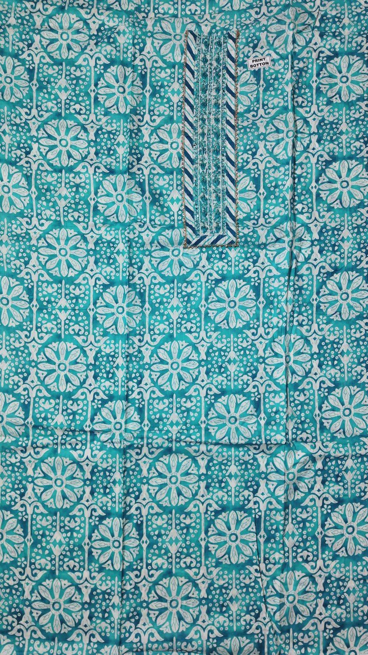 Step into a world where tradition meets contemporary charm with this unstitched suit in a tranquil azure palette. Crafted from premium quality fabric, this piece offers both comfort and durability, ensuring you stay at ease throughout any occasion. The intricate pattern showcases an artistic blend of floral and geometric designs, bringing forth a unique visual narrative.\n\nTailor it to your preferred style, whether you wish to create a chic kurta or a flowing salwar. The breathable fabric is gentle against the skin, making it ideal for festive gatherings or leisurely summer strolls. Adorned with subtle embellishments, the suit exudes a hint of sparkle, providing just the right amount of elegance.\n\nCare is simple—hand wash in cold water to maintain the fabric’s integrity and vibrant hue. This handcrafted set is not just a piece of clothing, but an expression of art and culture. Elevate your wardrobe today with a creation that speaks volumes about sophistication and timeless grace.