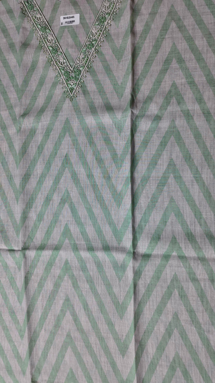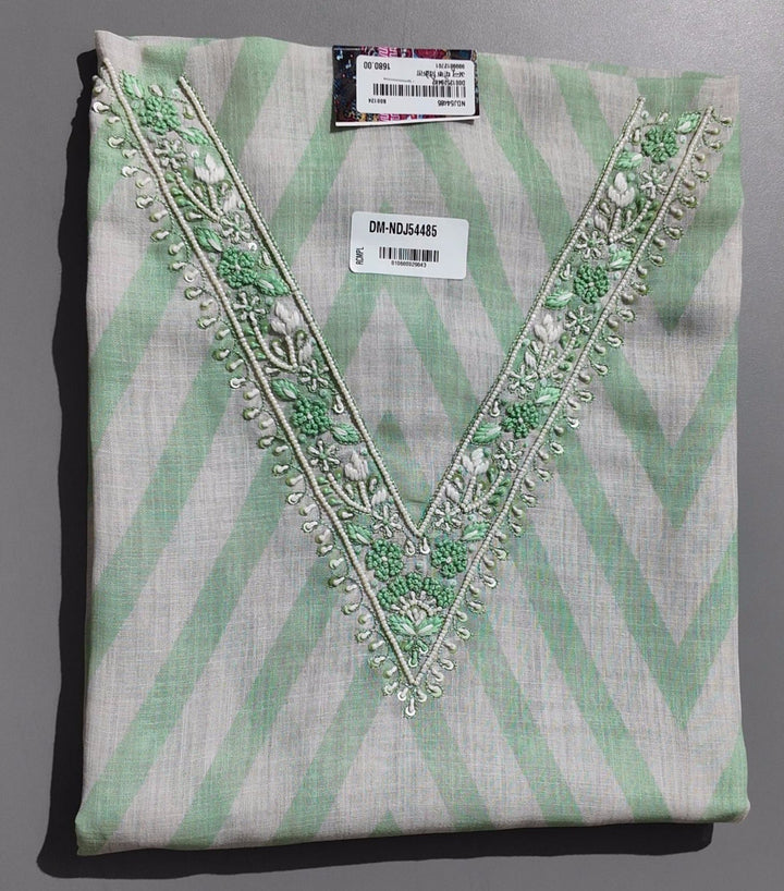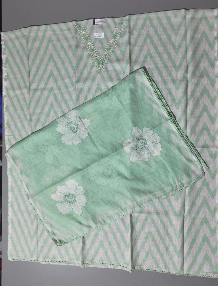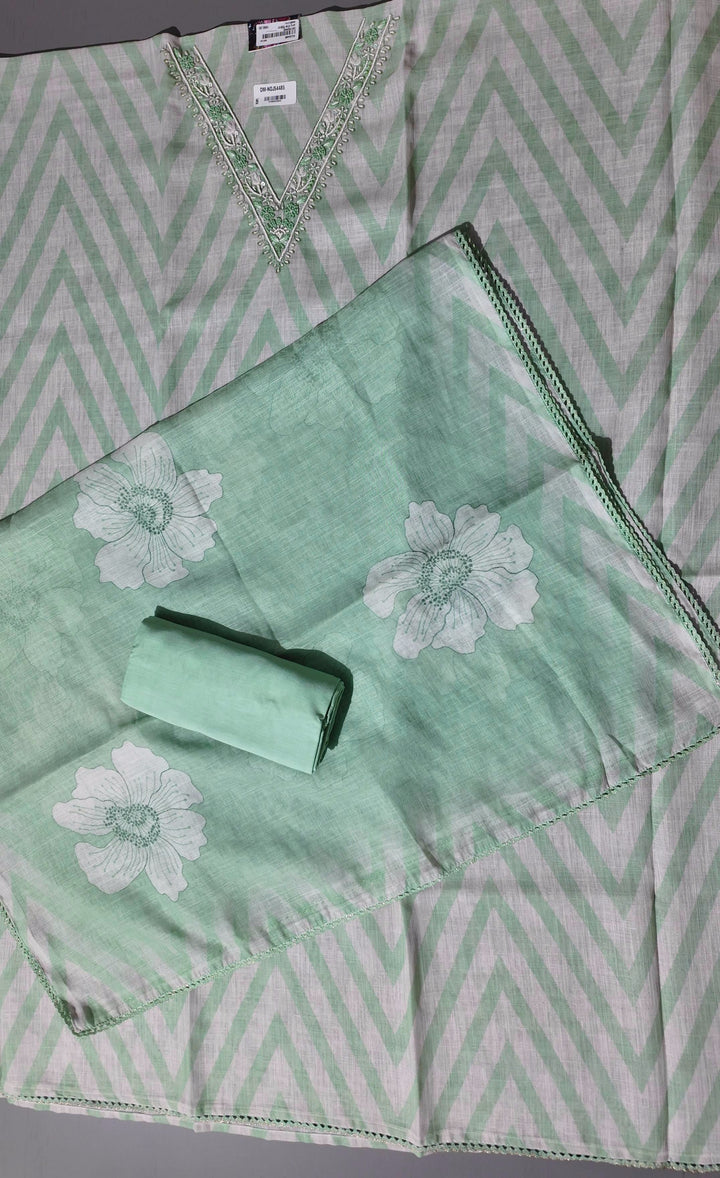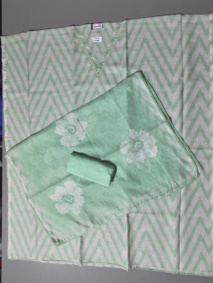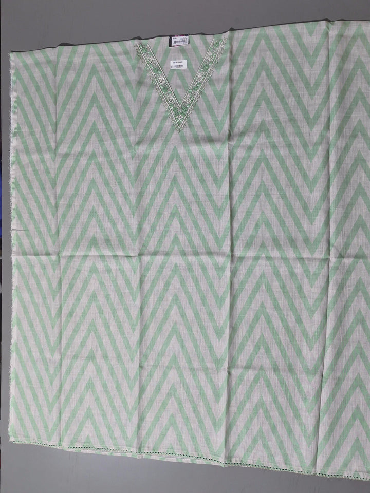 Step into a world of understated grace with our unstitched suit, crafted from premium fabric that offers both comfort and style. The soft mint green hue, adorned with intricate embroidery, imbues a touch of freshness and sophistication. Perfect for casual gatherings or festive occasions, this suit promises versatility with its classic design.\n\nThe fabric feels gentle against the skin, ensuring all-day comfort, while the detailed embroidery showcases skilled craftsmanship, adding a layer of luxury. The unstitched nature allows for a custom fit, tailored to your unique silhouette, providing the freedom to express your personal style.\n\nEasy to care for, this suit can be hand washed or dry-cleaned to maintain its pristine condition. Whether pairing it with subtle accessories for a day look or enhancing it with statement jewelry for a night out, this suit is a delightful canvas for style expression. Embrace this elegant piece and let it become a staple in your wardrobe, a testament to timeless fashion.