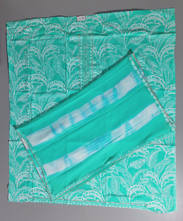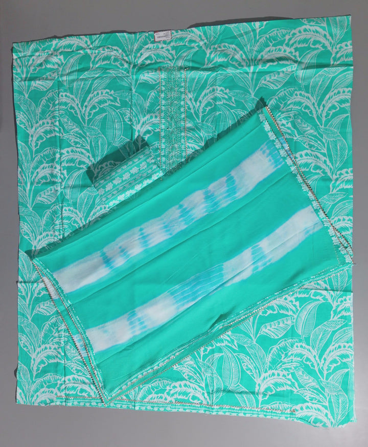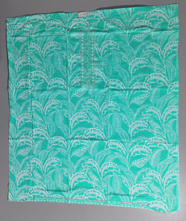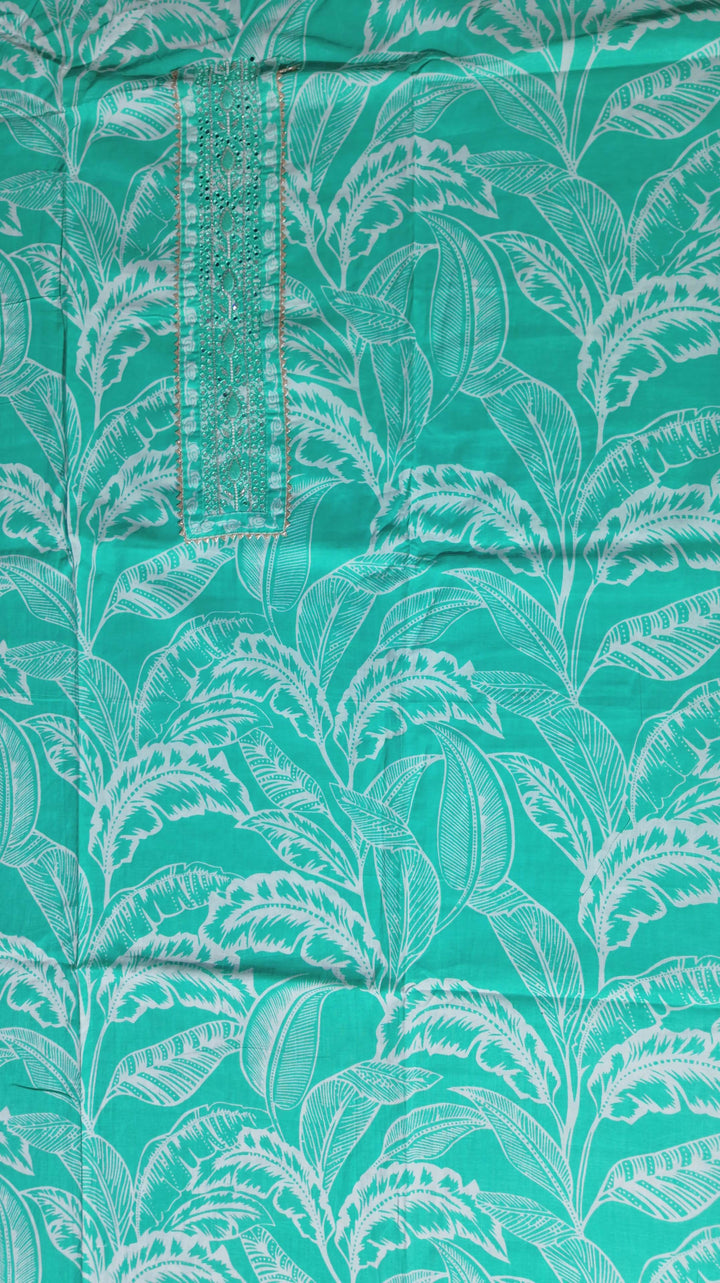 Dive into the serene vibes of a tropical paradise with our Tropical Bliss Unstitched Suit. This ensemble features a refreshing turquoise base adorned with intricate, leaf-inspired patterns. The centerpiece is a beautifully detailed embroidery strip, adding a touch of sophistication to this versatile fabric.\n\nCrafted for comfort and charm, this suit is perfect for day-outs, festive gatherings, or casual socials. Let your creativity flow as you personalize the fit to match your unique style. The soft fabric ensures breathability and ease, making it suitable for warm climates or bustling activity-filled days.\n\nMaintenance is a breeze with easy-care instructions, allowing you to keep the fabric looking vibrant and fresh with minimal effort. Embrace the spirit of a flourishing garden and make a memorable impression wherever you go.\n\nUnlock limitless styling possibilities and celebrate your individuality with this unique piece that promises not just a look, but an experience of tranquil elegance.