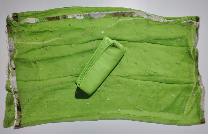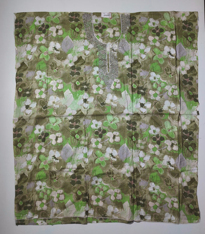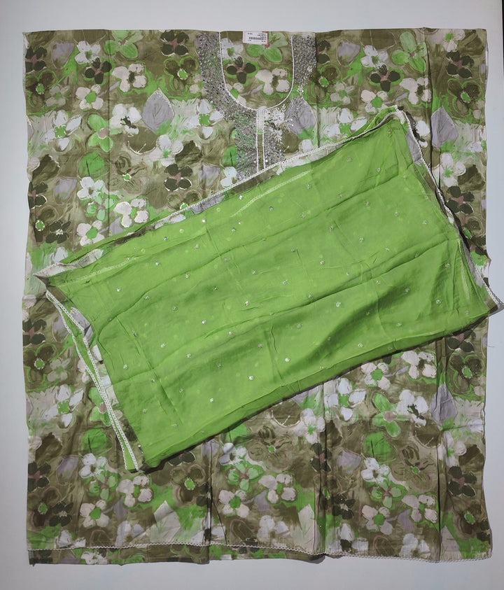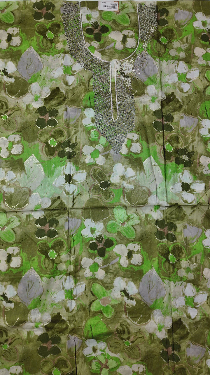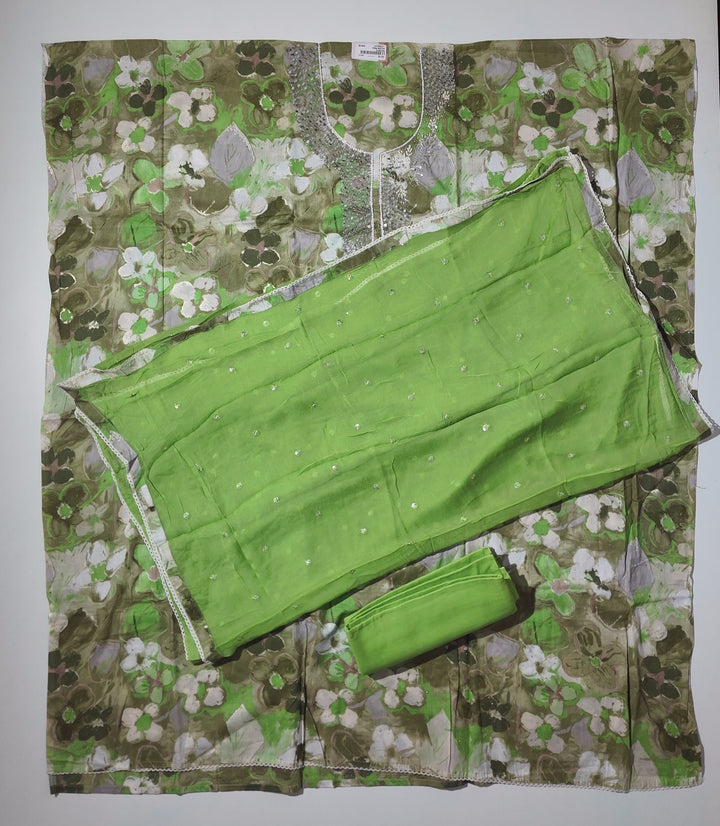 Step into nature's embrace with our 'Verdant Blossom' unstitched suit, a harmonious blend of earthy greens and lush floral motifs. Crafted in premium chiffon fabric, this ensemble promises both comfort and flair, allowing you to customize the fit to your personal style. The front panel is adorned with delicate sequins and beadwork, adding a touch of sparkle against the lush green background. Perfect for festive gatherings or casual outings, its breathable fabric ensures all-day comfort. Easy to maintain, this suit only requires gentle hand washing to preserve its intricate beauty. Unleash your creativity and tailor this exquisite piece to match your unique style. Ideal for those who seek elegance with a dash of nature's charm, 'Verdant Blossom' is not just an outfit, but a canvas of timeless artistry.