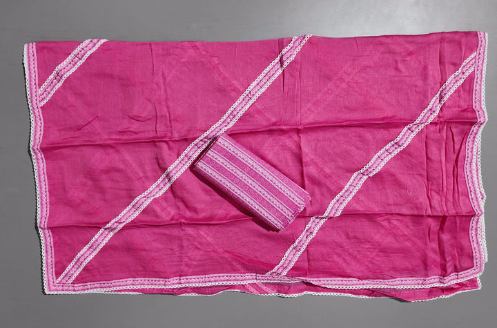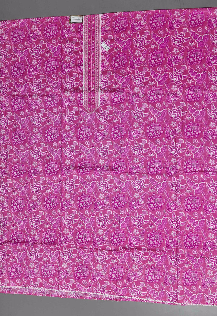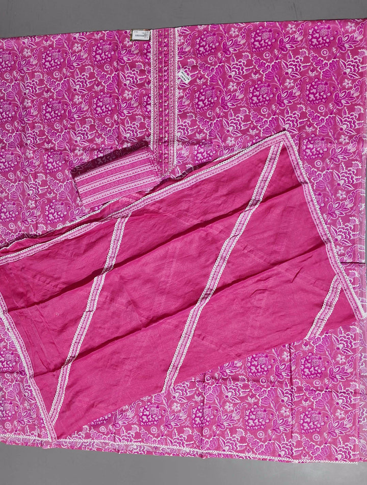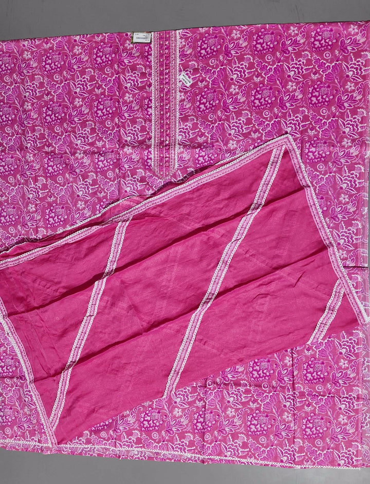 Step into the spotlight with our unstitched suit, a canvas of rich pink hues and intricate floral patterns, designed for festive occasions and cultural celebrations. This ensemble captures attention with its bold color palette and delicate lace detailing, embodying both tradition and modernity. Crafted for the discerning fashion enthusiast, the breathable fabric ensures all-day comfort, making it ideal for both day-long events and evening gatherings.\n\nThe detailed embroidery and sequin accents bring an element of glamour, perfect for the fashion-forward individual seeking to make a statement. Customize the fit to your preference, allowing you to express your personal style effortlessly.\n\nCarefully curated for those special moments, this unstitched suit invites creativity and customization. While its durability ensures it remains a staple in your wardrobe, simple hand-washing and air-drying preserve its vibrant color and intricate designs.\n\nWhether attending a family celebration or a cultural festival, this suit promises to elevate your wardrobe and captivate your audience. Transform this material into your dream outfit and experience the allure of timeless elegance and modern charm.
