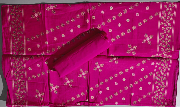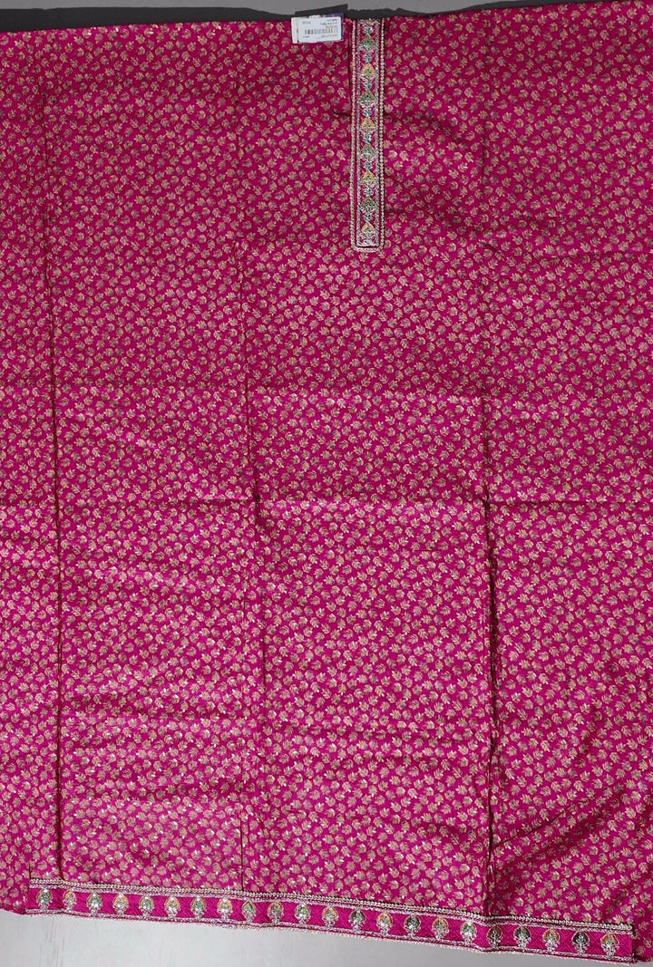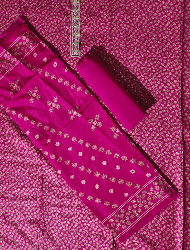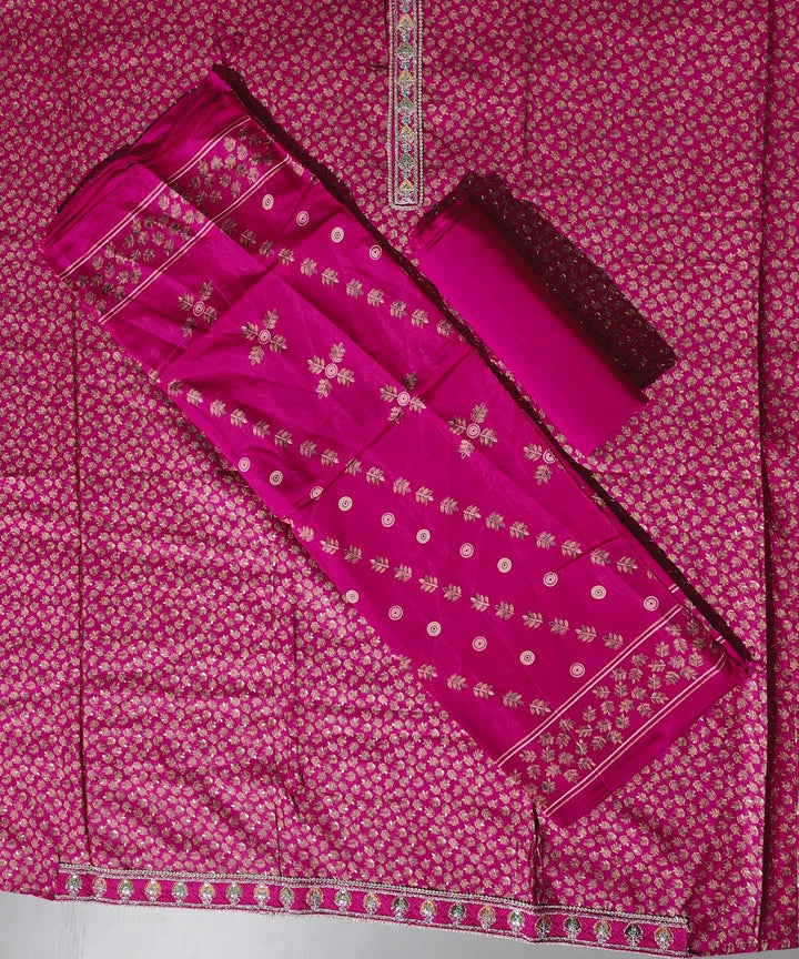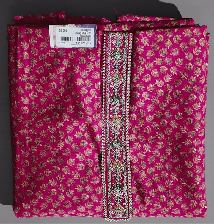 Step into a world of vibrant allure with our unstitched suit, designed for those who appreciate fine detail and craftsmanship. This suit boasts a rich fuchsia hue, intertwined with an eye-catching gold floral pattern, crafted from premium brocade fabric. Each thread is meticulously placed to create a lush texture that speaks of luxury and no-nonsense style. \n\nThe piece is accentuated by an ornate embroidered border, featuring delicate patterns in complementing colors, adding an extra layer of sophistication. This versatile fabric is perfect for festive occasions and can be tailored to fit your unique style, offering both comfort and elegance in one package.\n\nCaring for this masterpiece is a breeze: simply hand wash with mild detergent and air dry to maintain its vibrant color and texture. Whether you're attending a lavish celebration or a simple family gathering, this suit promises to make you the centerpiece of admiration and conversation. Transform your wardrobe with this exquisite piece and let your outfit reflect your impeccable taste.