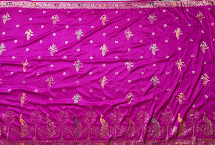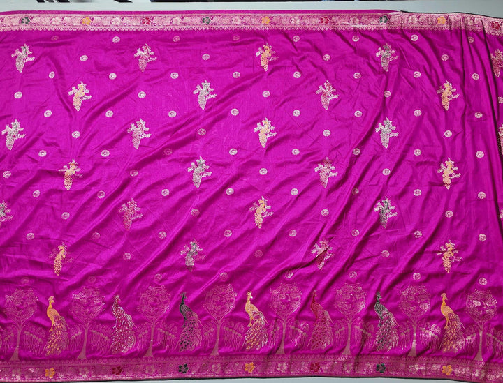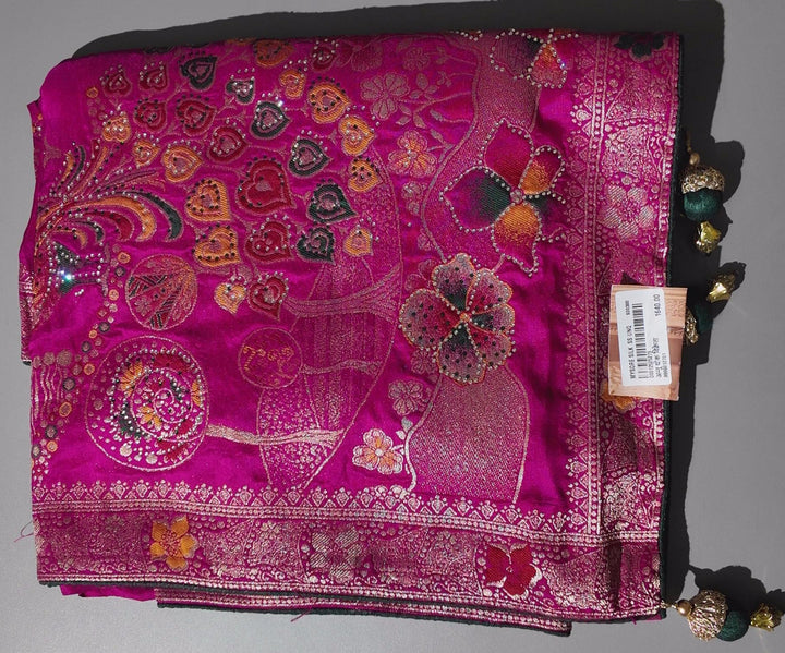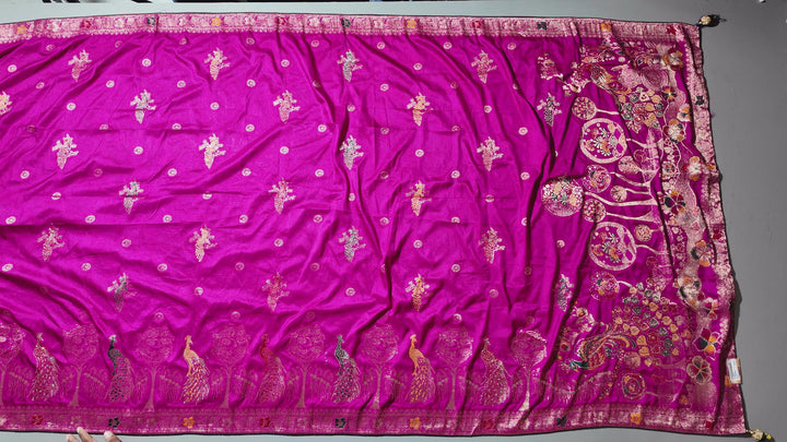 Unleash your creative flair with this exquisite unstitched suit in a captivating fuchsia hue. Crafted from premium fabric, this suit is adorned with meticulously detailed floral embroidery that gleams with hints of gold and multicolored accents. Ideal for festive occasions or special gatherings, the rich texture and artistic patterns create a statement of sophistication and tradition.\n\nThis ensemble offers a versatile canvas for customization, allowing you to design a garment that perfectly fits your style and silhouette. The fabric is soft and breathable, ensuring comfort throughout the day, while the intricate craftsmanship showcases a dedication to quality and detail.\n\nTo maintain its vibrant color and intricate designs, we recommend gentle hand washing or dry cleaning. Transform this enchanting piece into an elegant attire for weddings, celebrations, or cultural events, and revel in the compliments you'll receive. Priced at ₹1640.0, it’s a perfect blend of elegance and affordability, waiting to be crafted into your next favorite outfit!