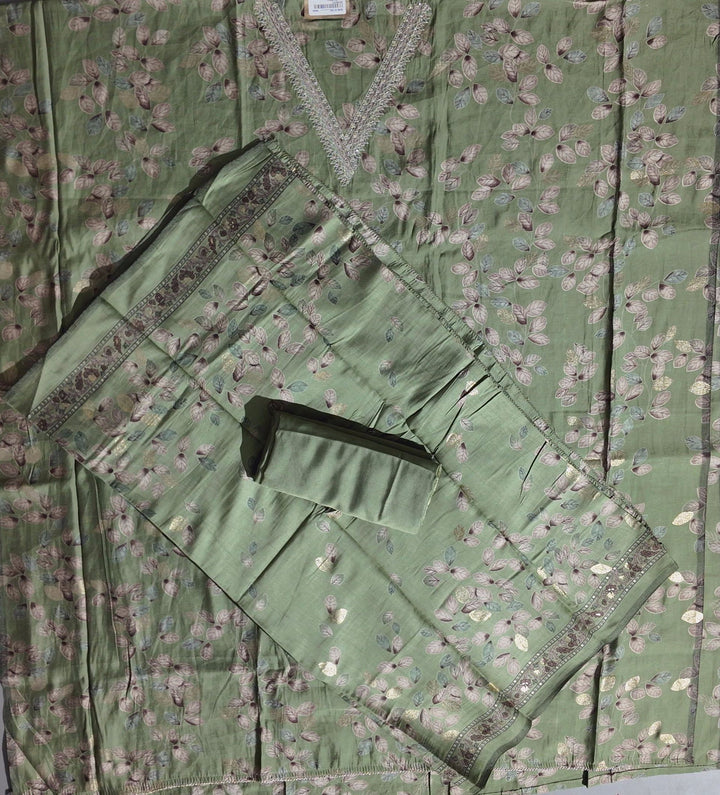 Step into a realm of enchantment with our Whimsical Forest Unstitched Suit, designed for those who seek the charm of nature in their festive wardrobe. This exquisite fabric features a serene sage green base, adorned with delicate foliage patterns that evoke the tranquility of a woodland wonderland. Perfect for celebrations and festivals, this suit can be tailored to suit your personal style, offering a canvas for creativity and individuality.\n\nCrafted for comfort and elegance, the fabric is lightweight and breathable, making it ideal for day-long wear during festive occasions. The intricate embroidery along the neckline adds a touch of sophistication, ensuring you stand out with grace and poise.\n\nPair this ensemble with statement jewelry and chic footwear to complete your look for weddings, family gatherings, or cultural celebrations. To keep your suit looking pristine, we recommend dry cleaning to maintain the vibrancy and texture of the fabric.\n\nThis forest-inspired attire invites you to express your unique sense of style, blending nature's beauty with traditional elegance. Let your outfit tell a story as you celebrate life's special moments in unmatched style and comfort. Embrace your creativity and transform this unstitched wonder into a garment that reflects your individuality.